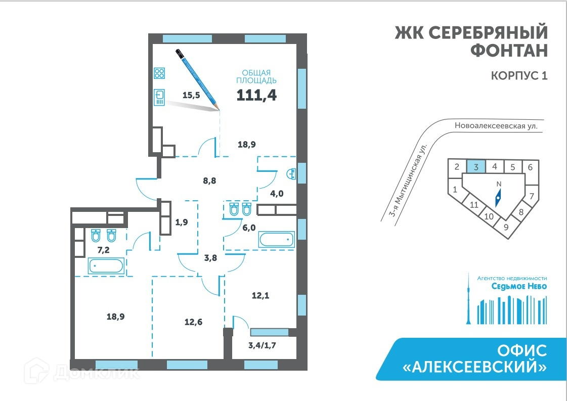 4-комнатная квартира, 111 м2, этаж 18 / 19, на продажу в Москве, 3-я Мытищинская улица, 16с52