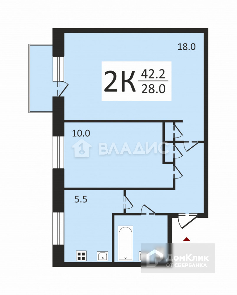 Общая площадь 42.2 м2