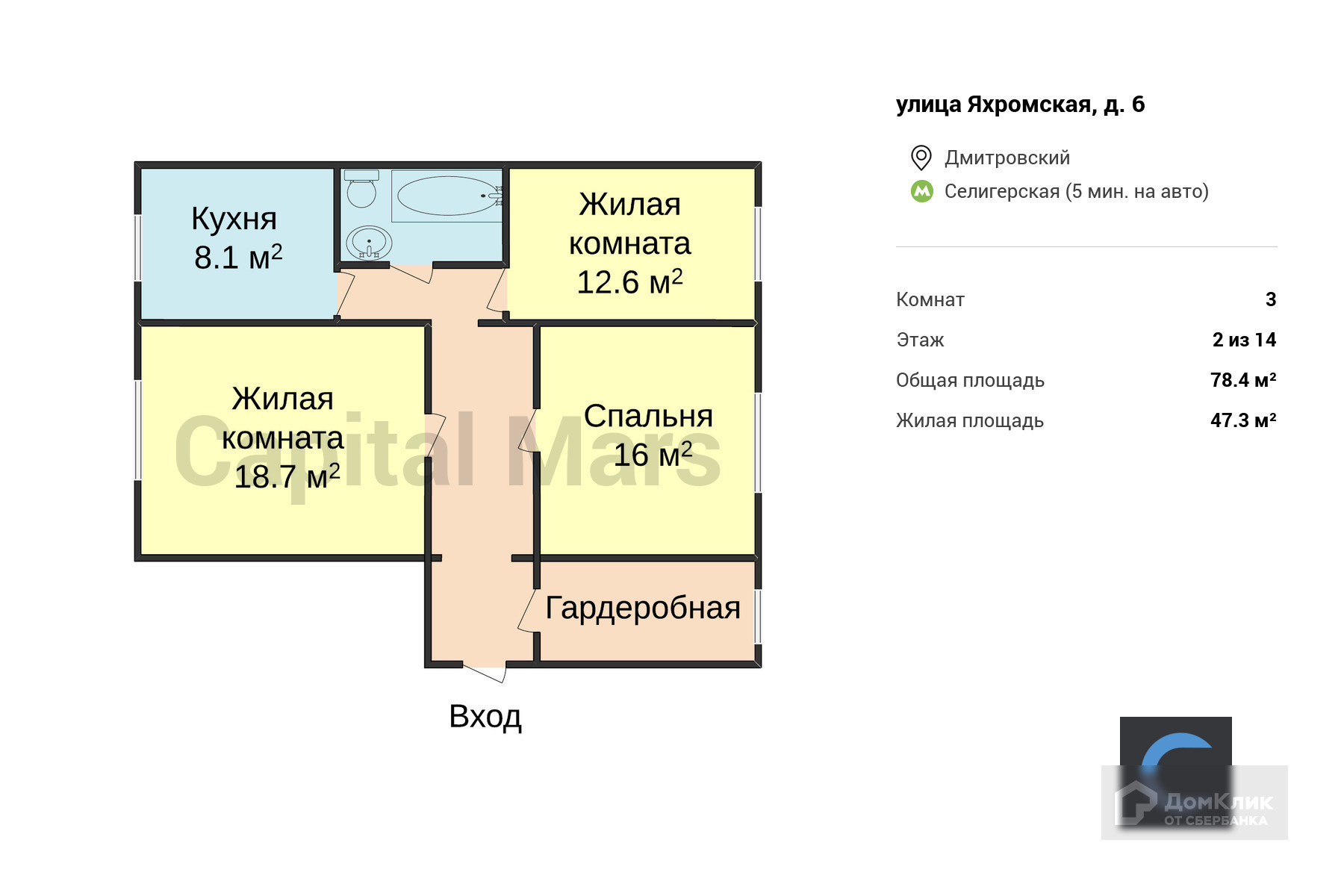 3-комнатная квартира, 78.4 м2, этаж 2 / 14, на продажу в Москве, Яхромская улица, 6