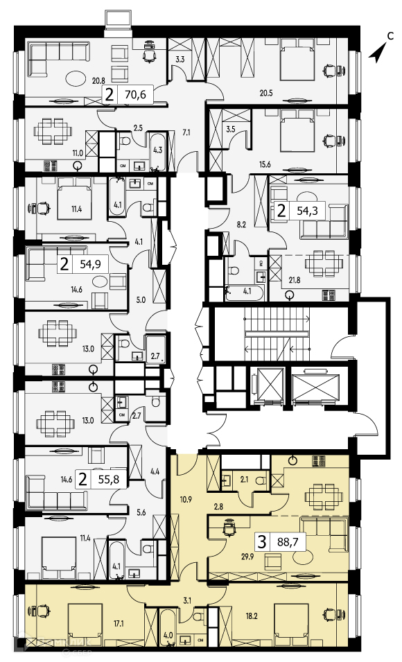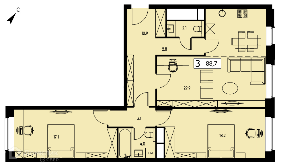 Общая площадь 88.7 м2