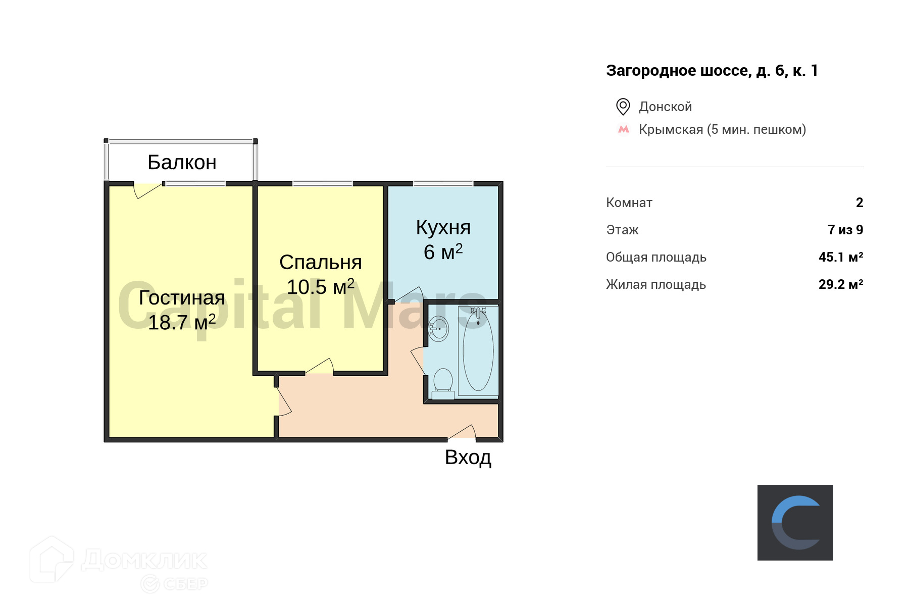 2-комнатная квартира, 45.1 м2, этаж 7 / 9, на продажу в Москве, Загородное шоссе, 6к1