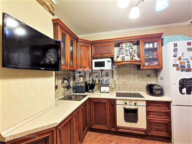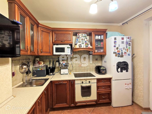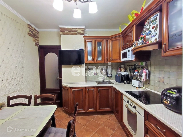 Установлен кухонный гарнитур из массива натурального дерева со встроенной бытовой техникой - варочная панель духовой шкаф, вытяжка, посудомоечная машина. На полу плитка. Из кухни выход на утепленную лоджию. На лоджии установлен шкав заменены стеклопакеты с поворотным механизмом и жалюзи.
