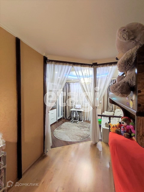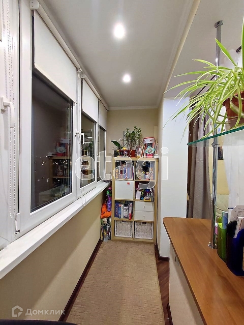 Комната объединена с утепленной лоджией , на которой проведен подогрев пола(ламинат) , заменены стеклопакеты, на лоджии оборудовано рабочеее место - кабинет. На подоконнике установлен стол из шпона натурального дерева