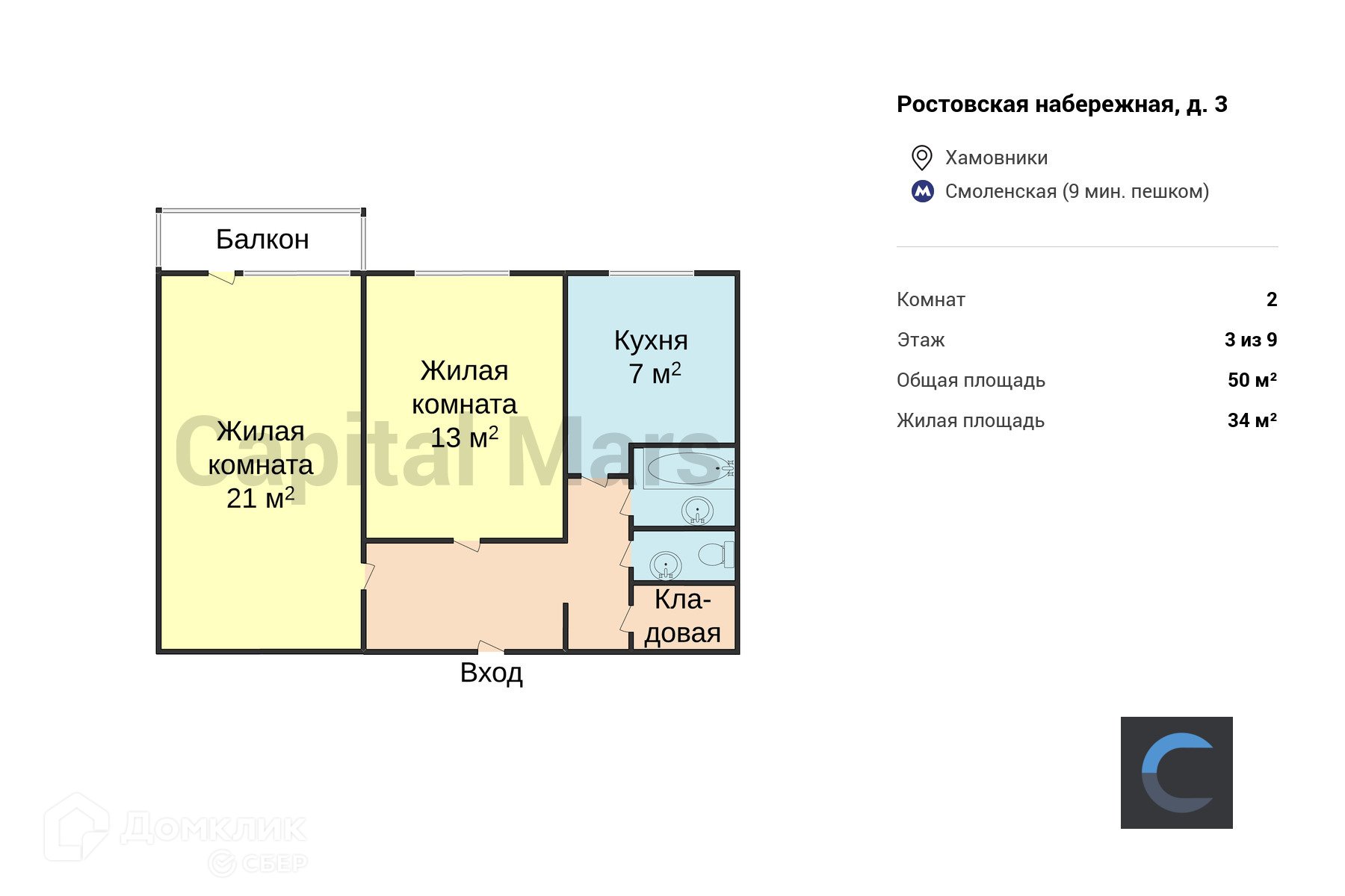 2-комнатная квартира, 50 м2, этаж 3 / 9, на продажу в Москве, Ростовская набережная, 3