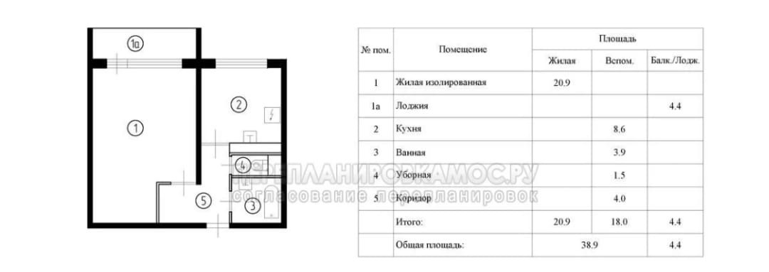 Общая площадь 38.9 м2