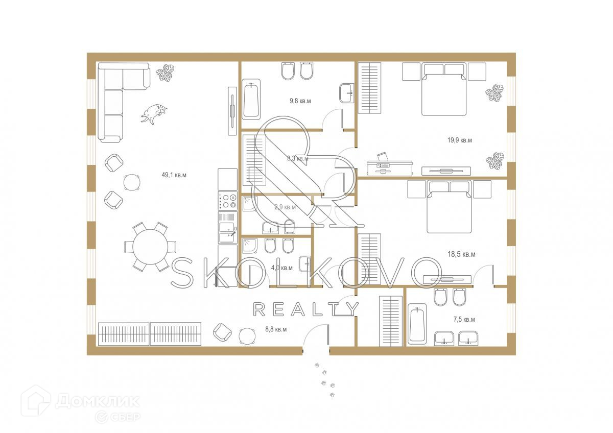 В квартире выполнена отделка под ключ. Планировка включает в себя кухню, объединенную со столовой и гостиной, две спальни с ванной и гардеробной комнатами, гостевой санузел, прачечную.