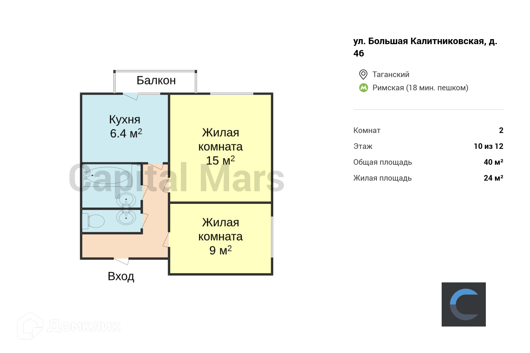 2-комнатная квартира, 40 м2, этаж 10 / 12, на продажу в Москве, Большая Калитниковская улица, 46