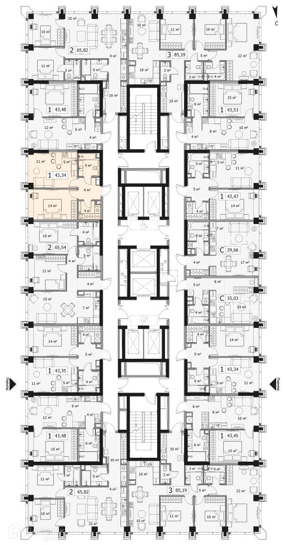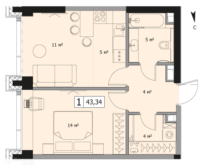 Общая площадь 43.34 м2