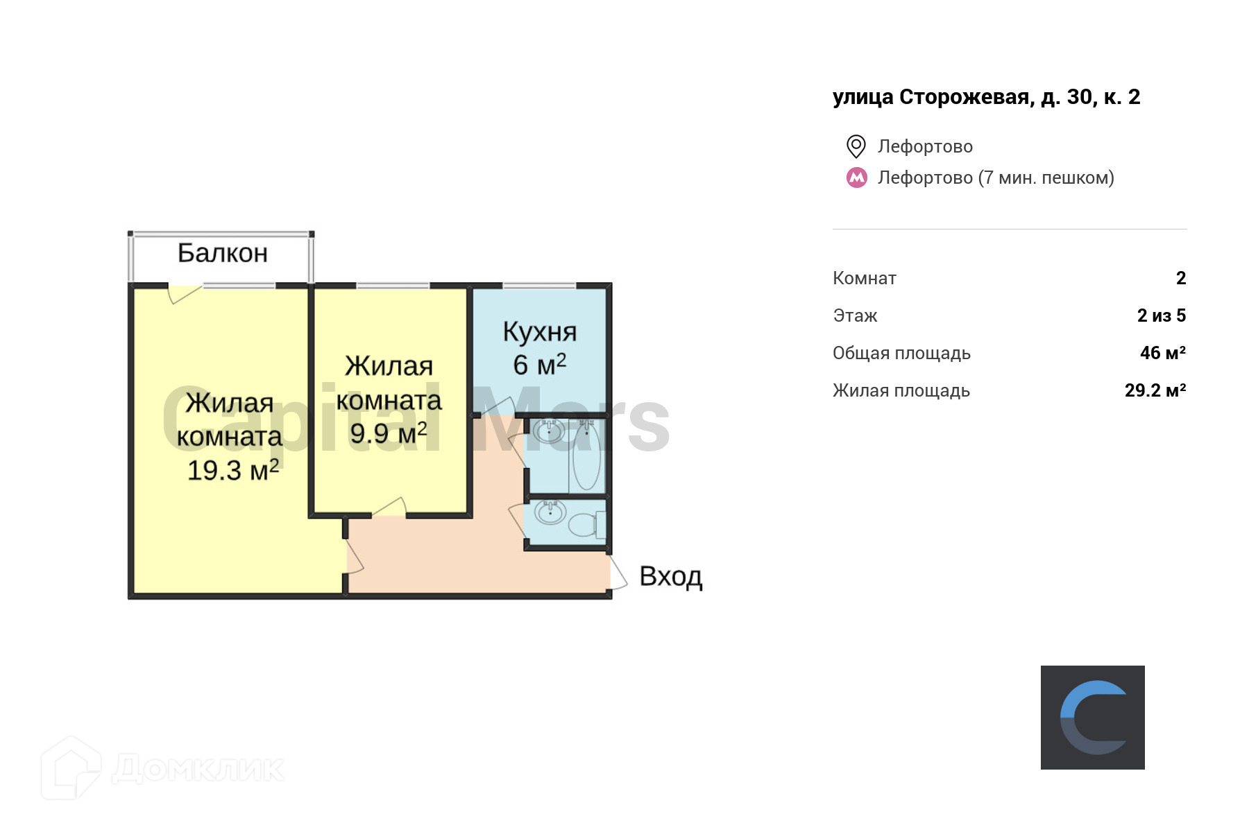 2-комнатная квартира, 46 м2, этаж 2 / 5, на продажу в Москве, Сторожевая улица, 30к2