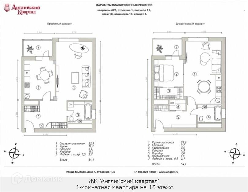 1-комнатная квартира, 53.1 м2, этаж 13 / 14, на продажу в Москве, Мытная улица, 7с2
