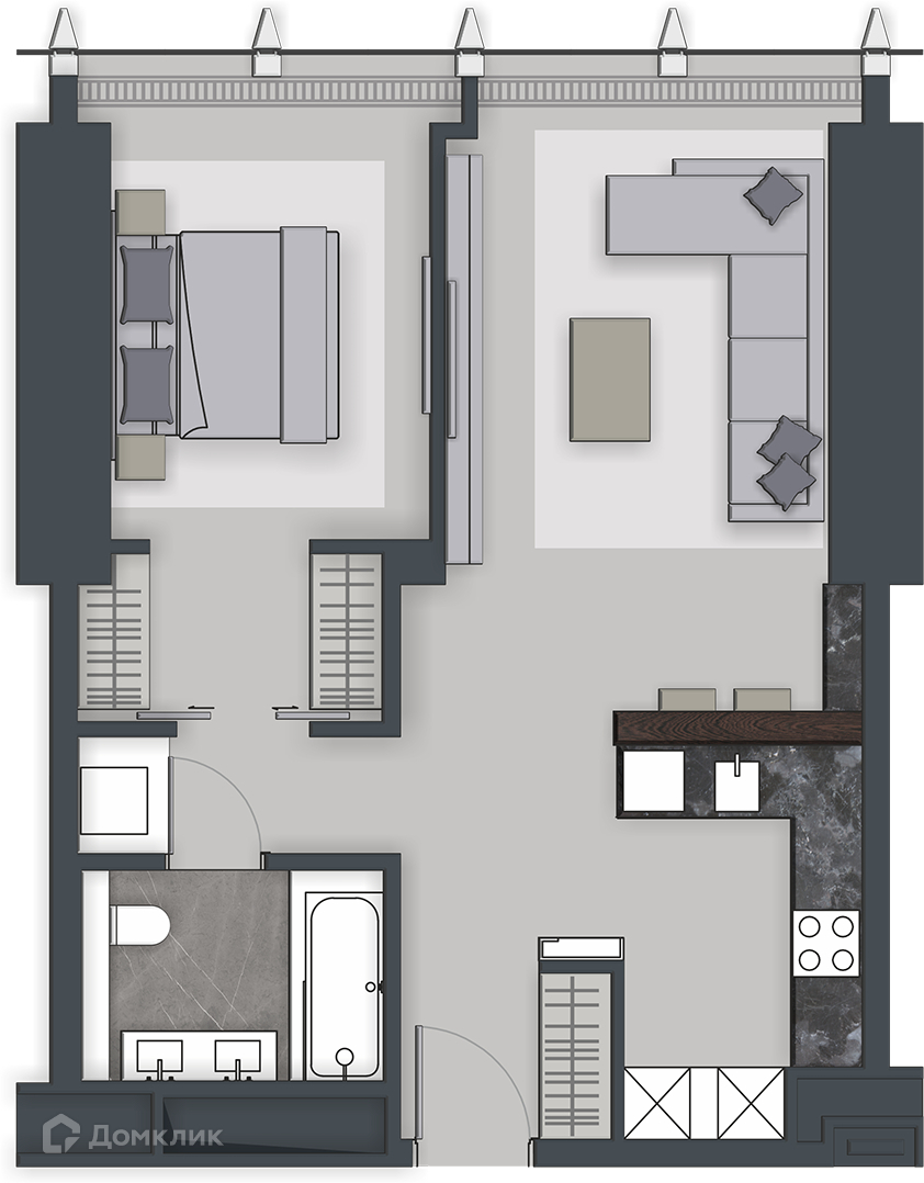 Функциональная планировка: кухня-студия, совмещенная с гостиной, спальня с гардеробной комнатой. Дизайнерская отделка.