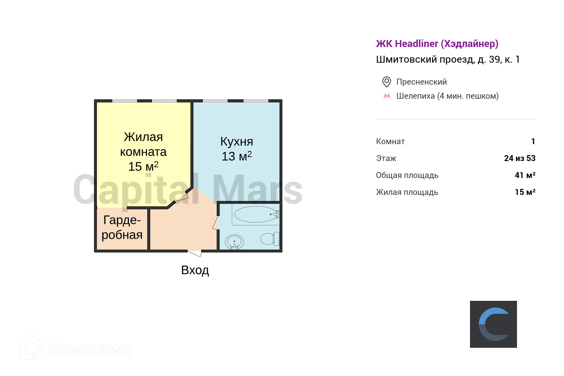 1-комнатная квартира, 41 м2, этаж 24 / 53, на продажу в Москве, Шмитовский проезд, 39к1