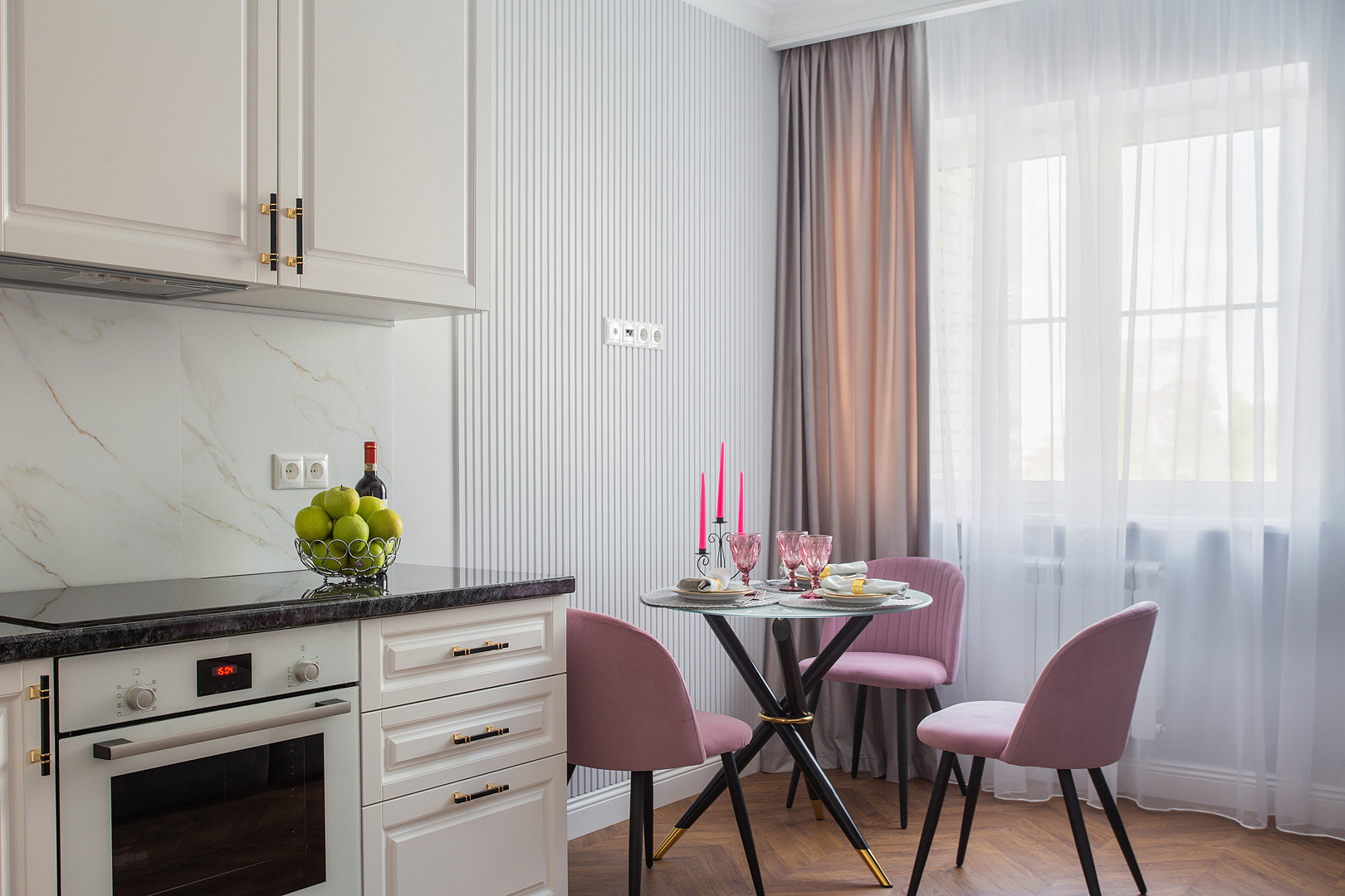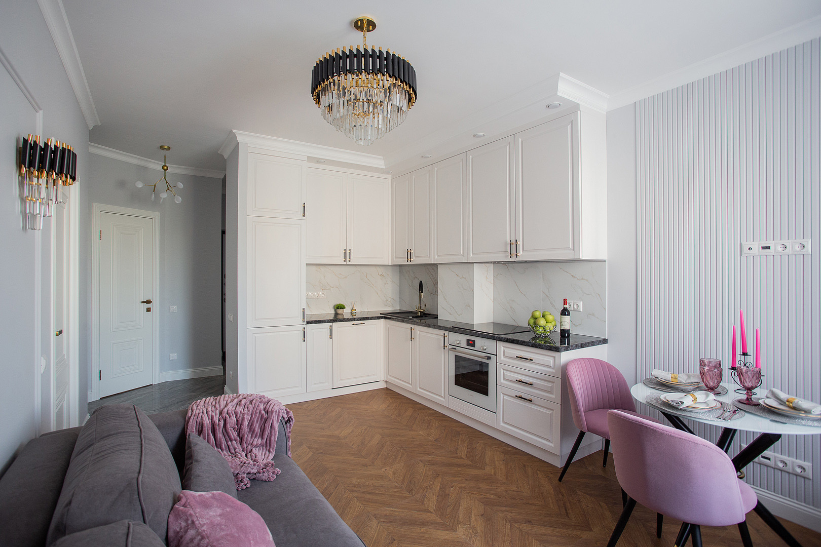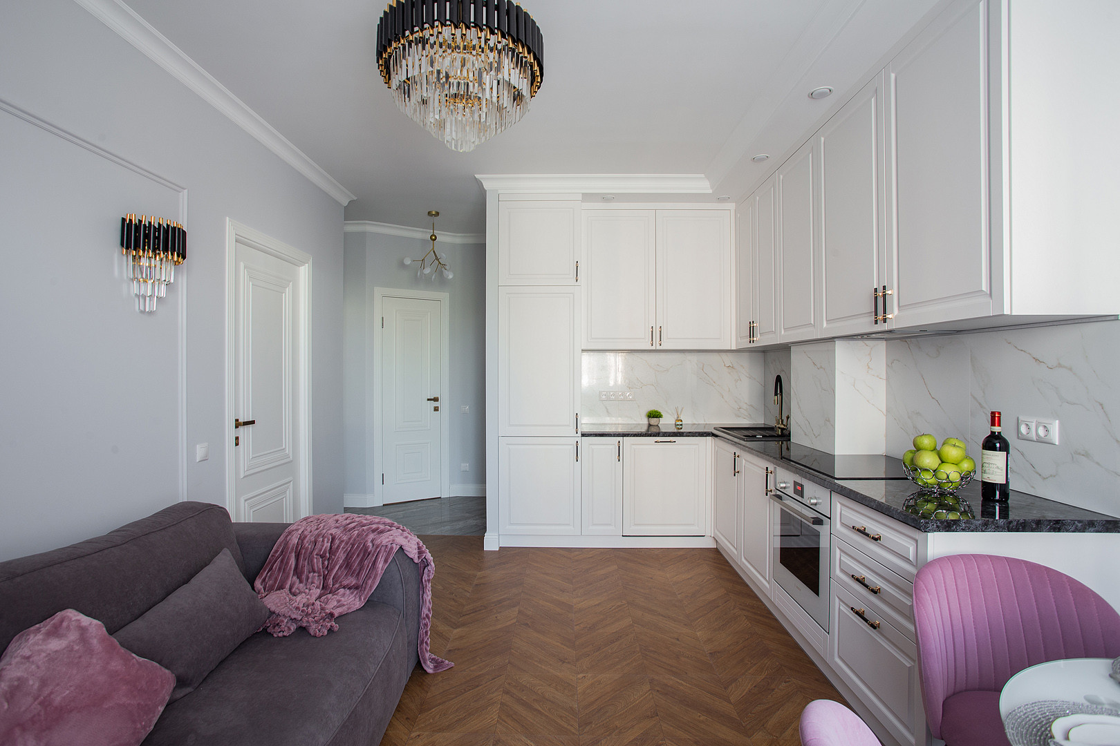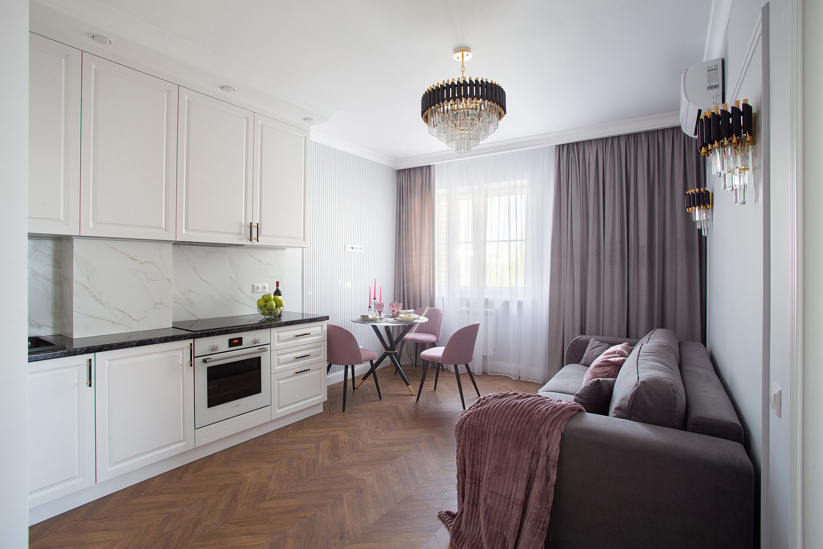 Квартира полностью укомплектована мебелью и  встроенной бытовой техникой БОШ: холодильник, посудомоечная машина, духовой шкаф, варочная панель, вытяжка, а также с любовью и с заботой к будущему собственнику подобран итальянский текстиль и предметы декора!