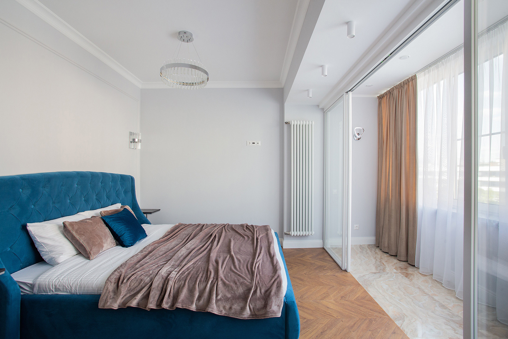 Функциональная планировка: кухня- гостиная 18 кв.м., спальня 17 кв.м с гардеробной комнатой, комната свободного назначения( детская, гостевая или кабинет), две лоджии, просторная прихожая, ванная 7 кв.м. с окном и гостевой сан/узел.