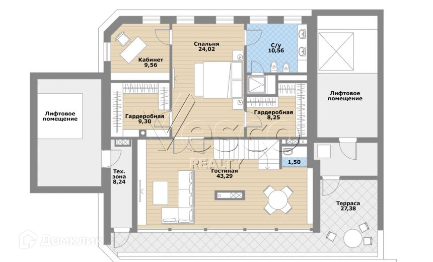 Планировка включает в себя: кухню, просторную гостиную, две спальни со своими санузлами, гостевой санузел.