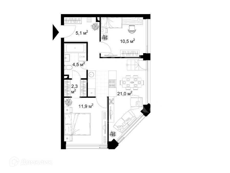 Общая площадь 55.3 м2