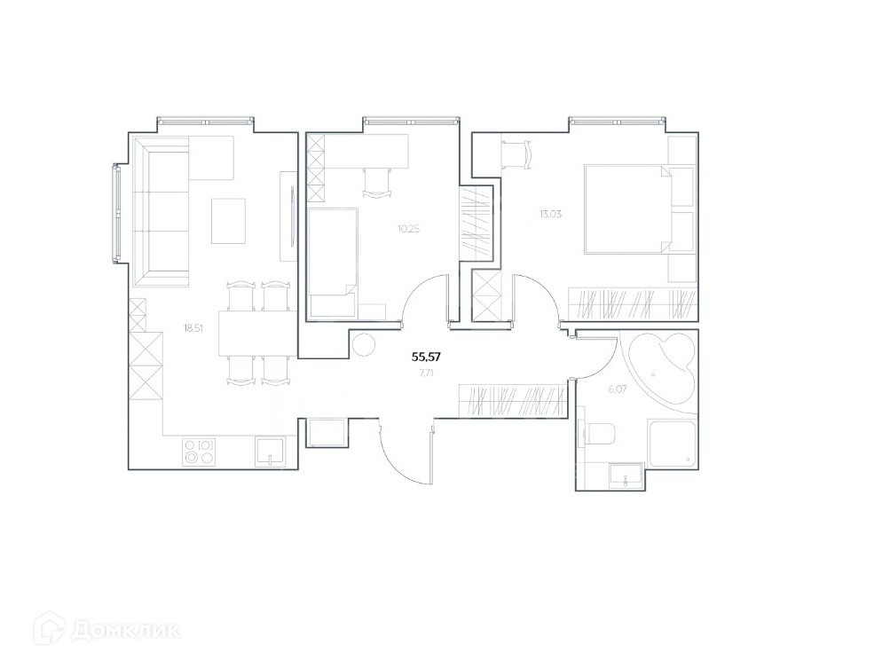 Апартаменты на 5 этаже площадью 55,60 кв.м.
