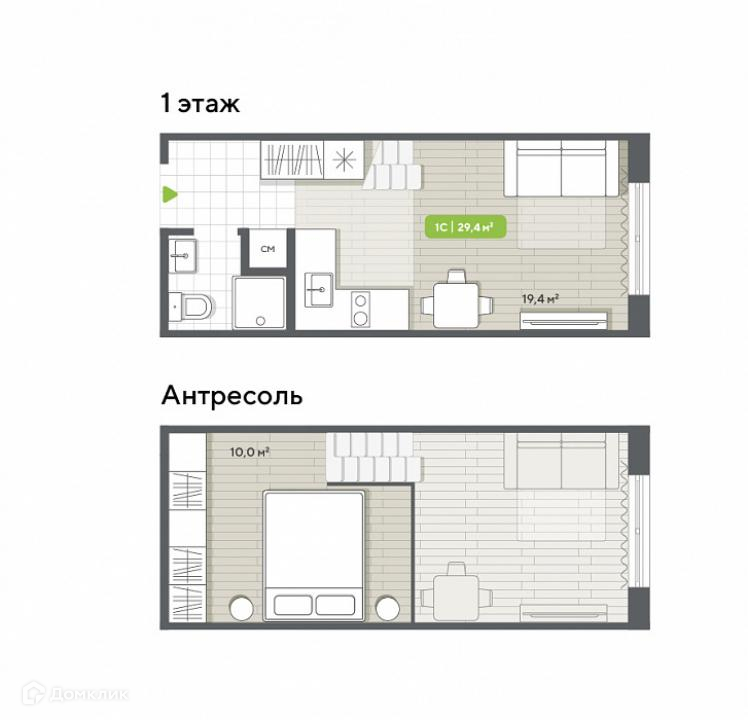 Площади апартаментов от 28,6 до 39,2 кв. м. Высота потолков равна 4 м.