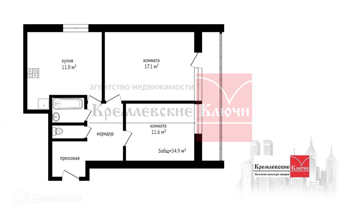 Общая площадь 54.9 м2