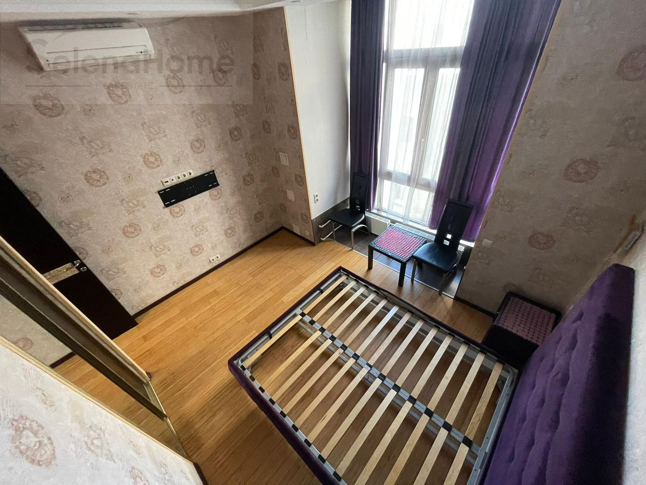 По планировке -  студия (24 кв.м) + спальня (10 кв.м), прихожая, совмещенный санузел с душевой кабиной.  Потолки - 4 м.
