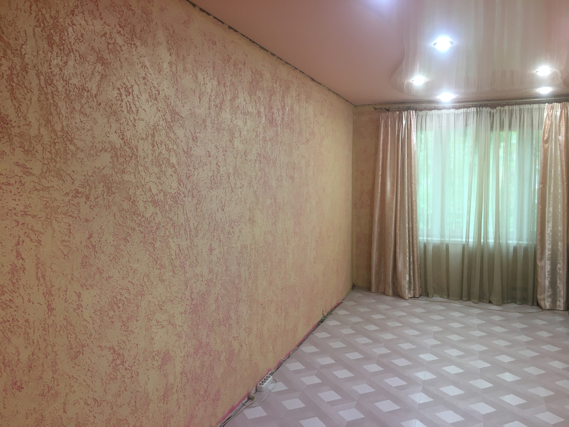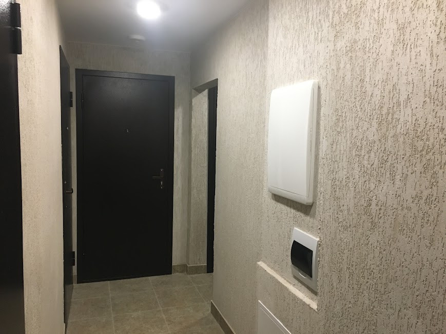 В общем коридоре выполнен качественный ремонт «под ключ»: на полу керамогранит, на стенах декоративная штукатурка светлых тонов, натяжной потолок, освещение — точечные светильники с датчиком движения.