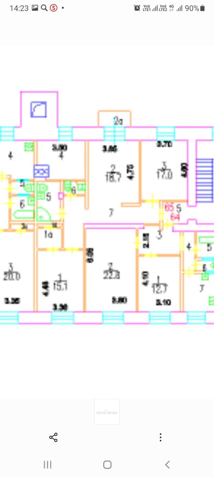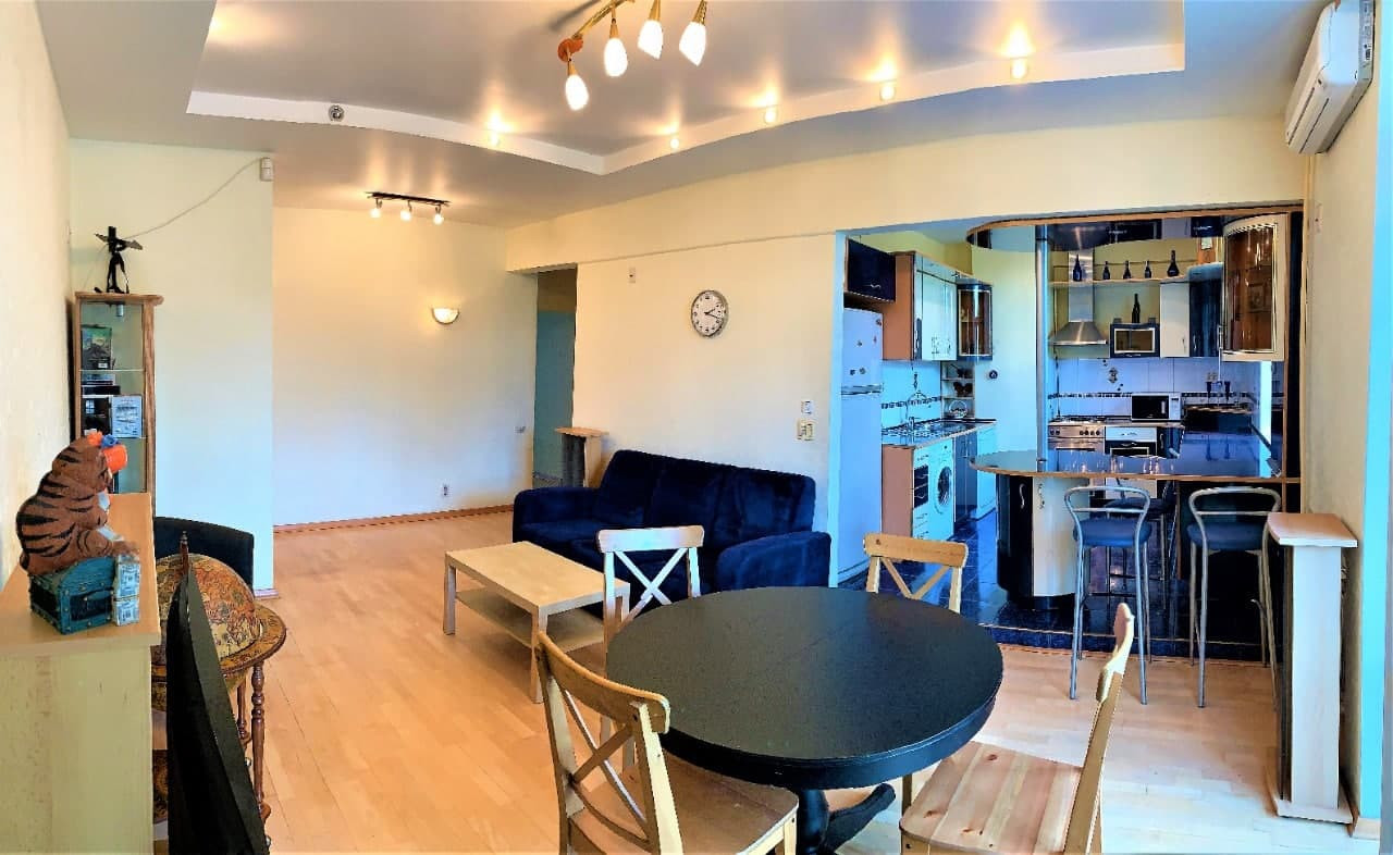 Общ. пл. - 84,3 кв.м. Жил. пл. - 50,8 кв.м. 2 изолир. Комнаты (17,0 кв.м. и 15,1 кв.м.). 3-я комната (18,7 кв.м.) объединена с кухней (5,40 кв.м.) в кухню-гостиную (24,1 кв.м.), со встроенной мебелью и бытовыми приборами. Разделена барной стойкой. Кухонный гарнитур выполнен на Заказ из Италии. Гардероб – отдельная комната – 3 кв.м..