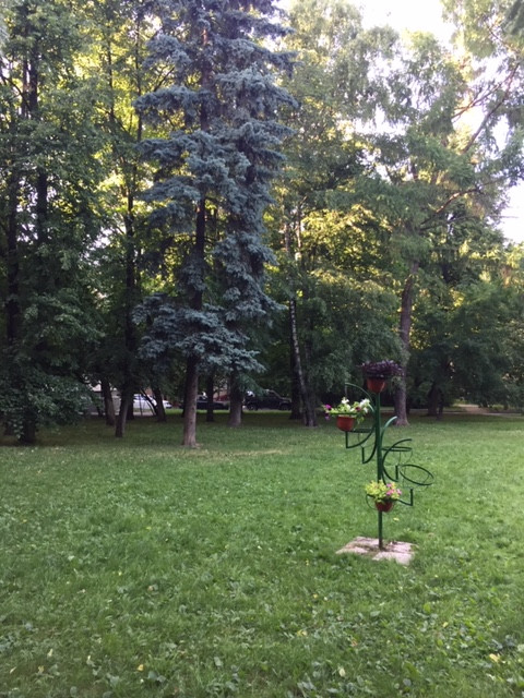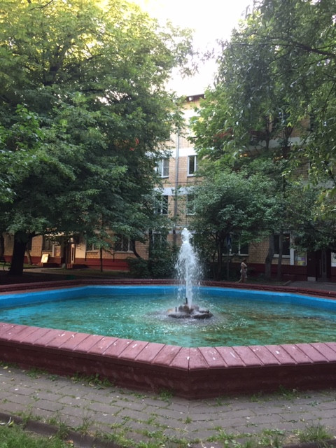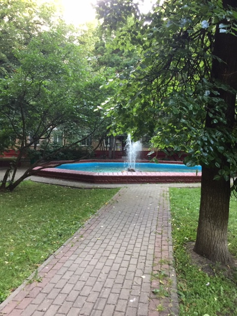 Зеленый большой двор со взрослыми деревьями (зеленая ель, вишня, яблоня), фонтаном и детской площадкой. Окна выходят во двор.