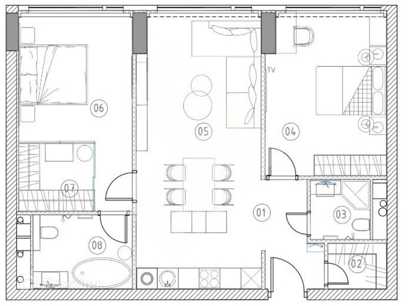 Функциональная планировка: кухня, 2 изолированные спальни, холл, 2 с/у.