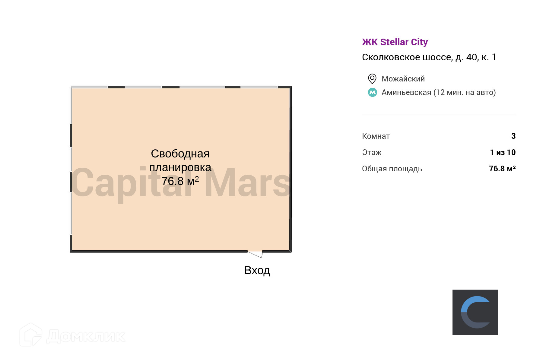 3-комнатная квартира, 76.8 м2, этаж 1 / 10, на продажу в Москве, Сколковское шоссе, 40к1