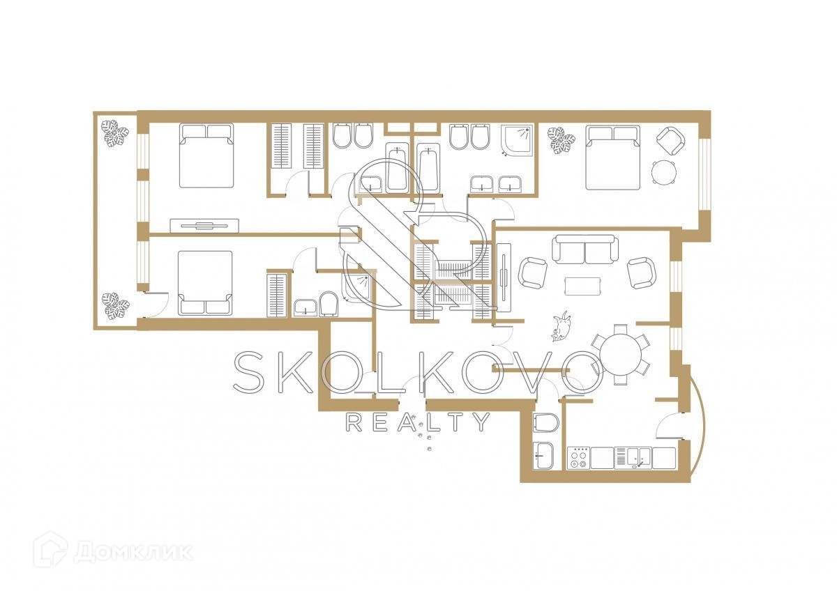 Планировочное решение: кухня, объединенная со столовой, гостиная, мастер-спальня с ванной и гардеробной комнатами, 2 гостевые спальни с санузлами, комнаты свободного назначения. Одним из преимуществ являются потолки высотой 3,5 метра. В квартире итальянские деревянные окна «Albertini», работает приточно-вытяжная система вентиляции и система кондиционирования.