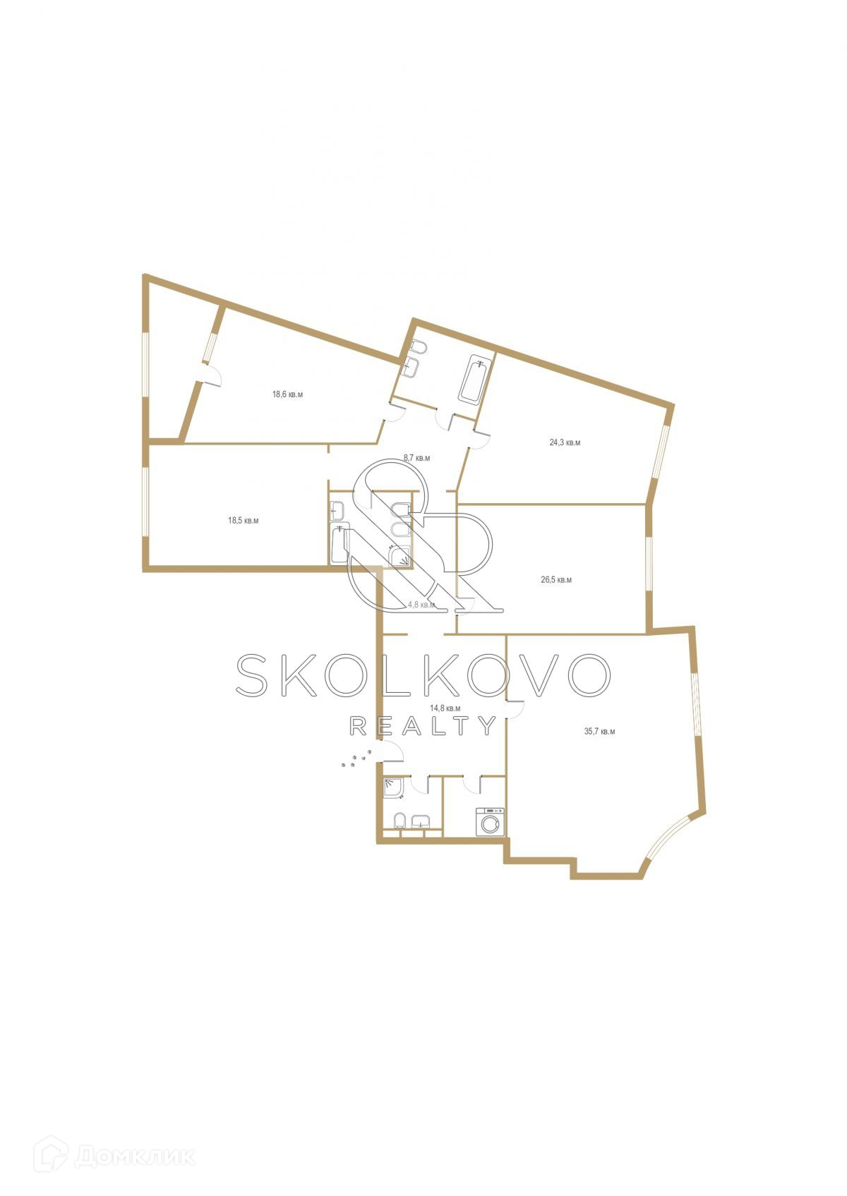 Свободная планировка позволяет разместить в квартире кухню, объединенную со столовой, гостиную 3 или 4 спальни с собственными гардеробными и санузлами или реализовать какой-либо другой проект.