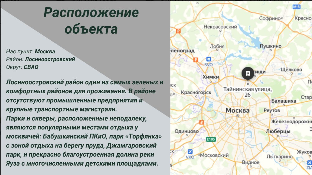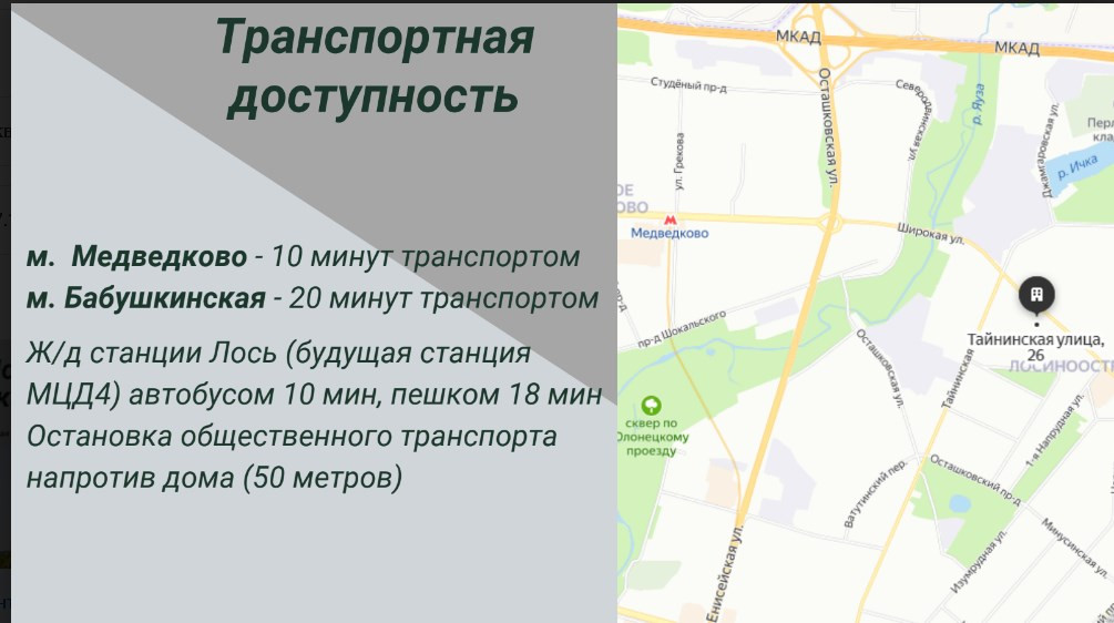 Транспортная доступность до двух станций метро Медведково, Бабушкинская автобусом 10-15мин.До ж/д станций Лосиноостровская и Лось- будущие МЦД-4 10- минут пешком, до Медведково 23 мин,до ст. Лось 19 минут.