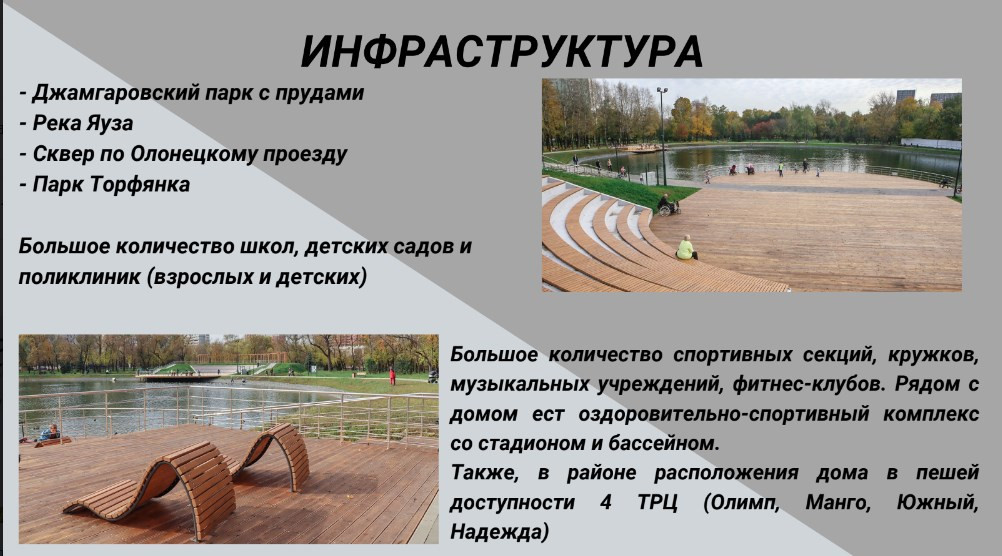Развита инфраструктура:возле дома детский сад, Сбербанк, почта, аптека, парикмахерская,ателье.По соседству несколько школ на выбор, взрослая и детская поликлиника, супермаркеты Билла,ВкусВилл, Пятерочка,Перекресток .Благоустроенный зеленый район - рядом Джамгаровский парк, Таежный сквер, парк Торфянка,пойма реки Яуза - в любом направлении можно совершать пробежки или гулять с питомцами.