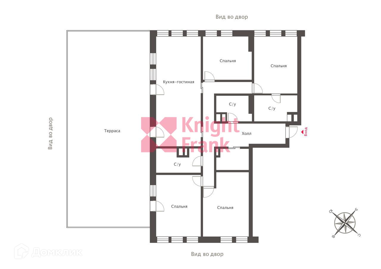 Оптимальный вариант организации пространства: гостиная-кухня, 3 спальни и кабинет, 2 полноценных и гостевой санузлы, гардеробная. Есть просторная терраса площадью 200 кв. м.