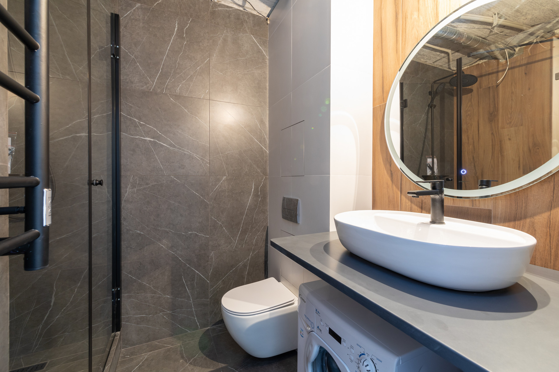 - сантехникой (стеклянная душевая кабина строительного исполнения, унитаз с инсталляцией, раковина, полотенцесушитель, зеркало),