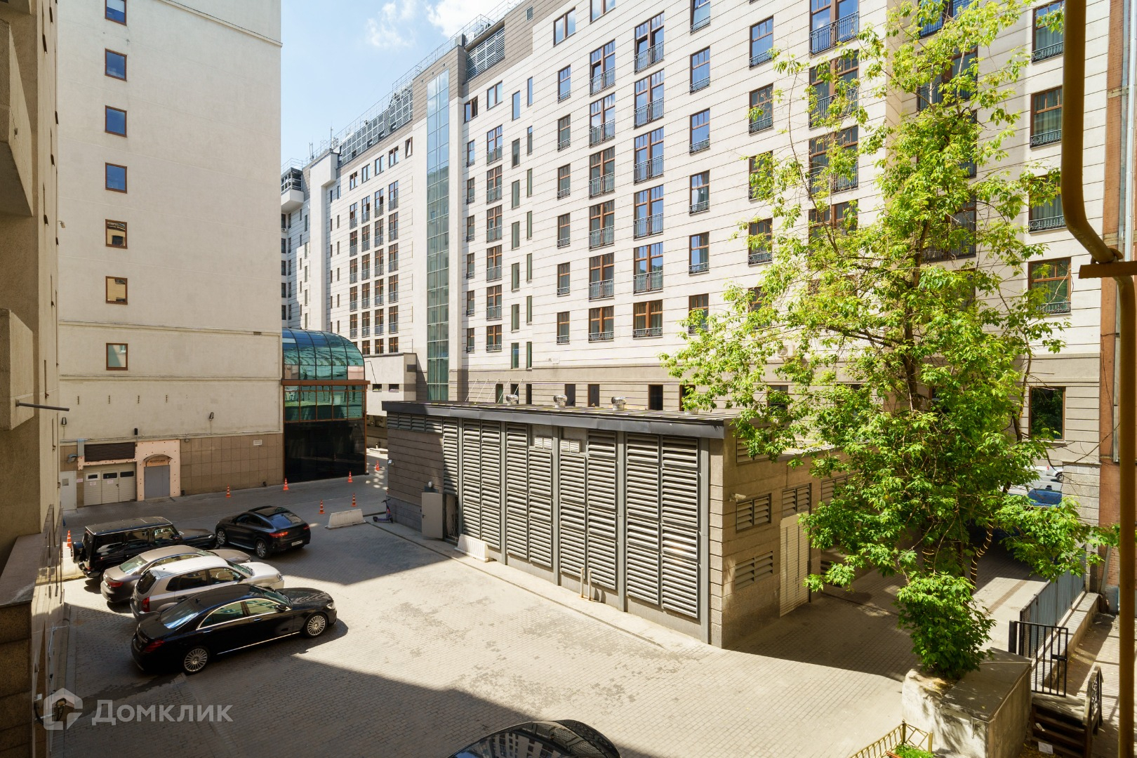Закрытая парковка рядом с домом, въезд во двор через шлагбаум.