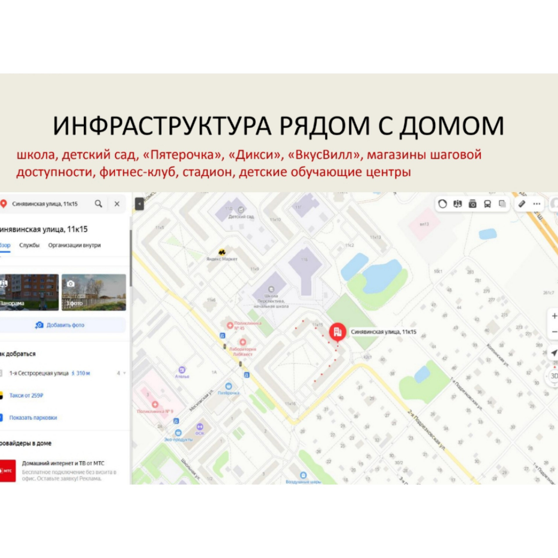 Развитая инфраструктура, магазины , детский сад, школа, салон красоты, спортивный клуб
