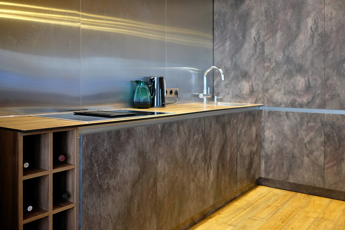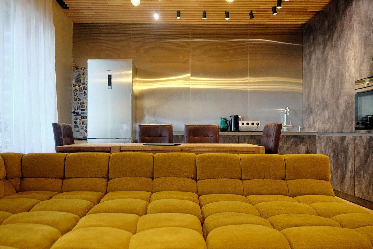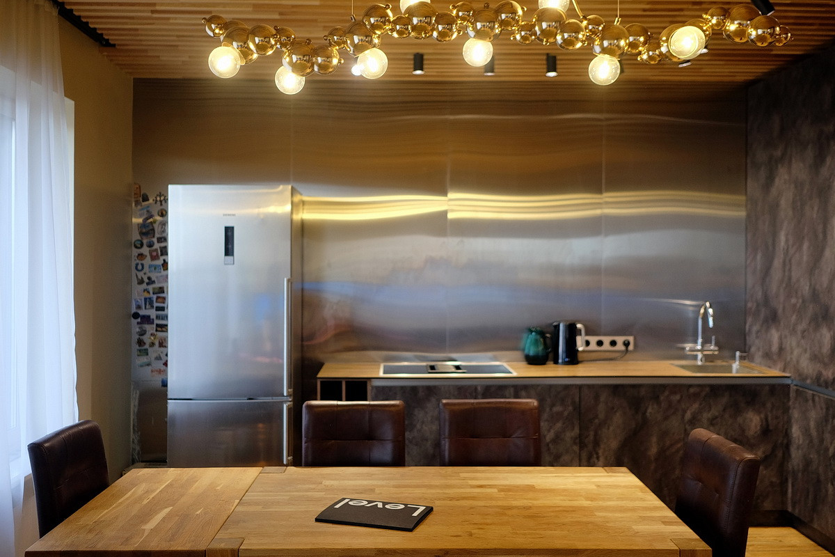 Дизайнерский ремонт, только дорогие натуральные материалы: полы - массив дерева, отделка стен - кирпич, керамогранит, металл, двери из дерева, различные группы освещения, сделана шумоизоляция пола, сантехника Villeroy & Boch, встроенная кухня с бытовой техникой Siemens и вместительный встроенный шкаф (общей стоимостью 1.3 млн. руб.), кондиционер Daikin Emura, бойлер Ariston, модульный диван Divanica.