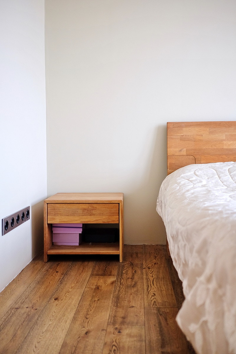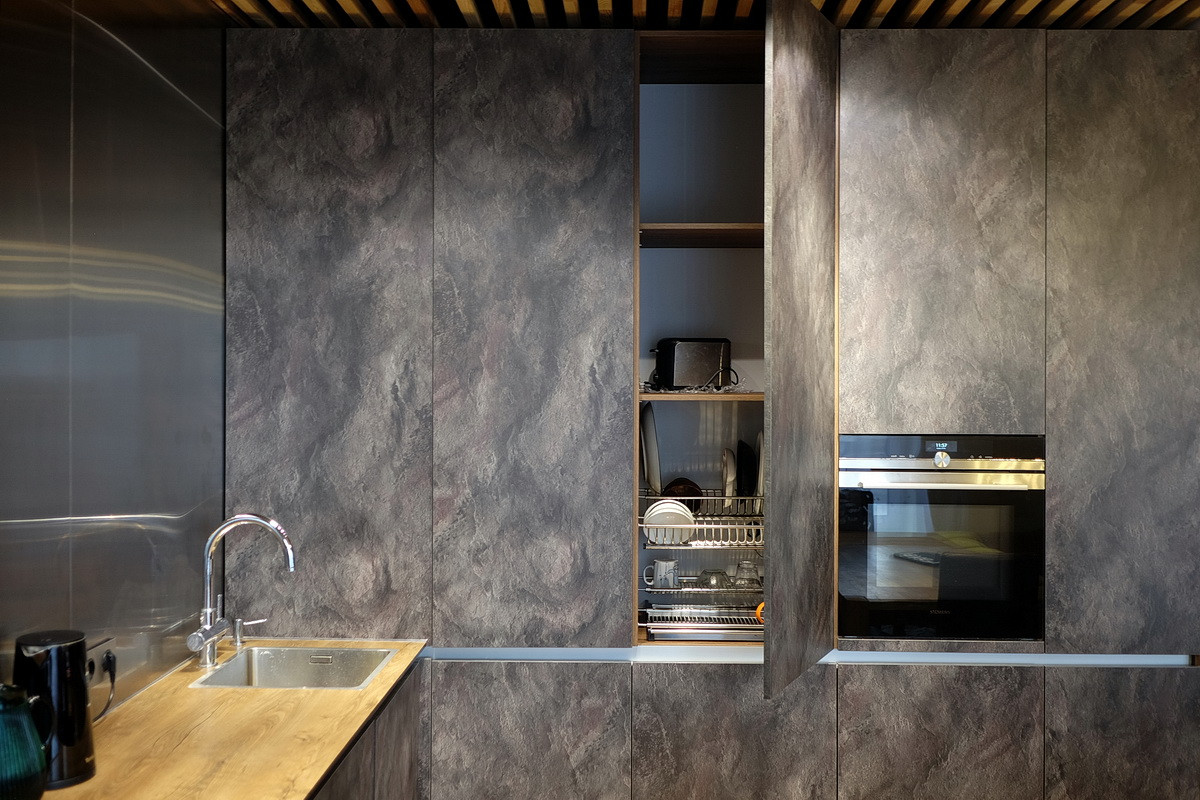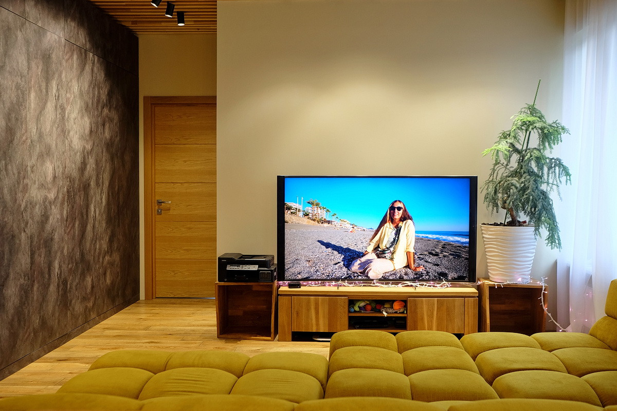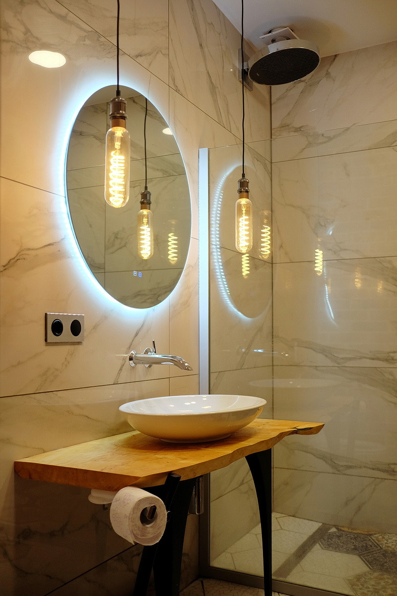 Дизайнерский ремонт, только дорогие натуральные материалы: полы - массив дерева, отделка стен - кирпич, керамогранит, металл, двери из дерева, различные группы освещения, сделана шумоизоляция пола, сантехника Villeroy & Boch, встроенная кухня с бытовой техникой Siemens и вместительный встроенный шкаф (общей стоимостью 1.3 млн. руб.), кондиционер Daikin Emura, бойлер Ariston, модульный диван Divanica.