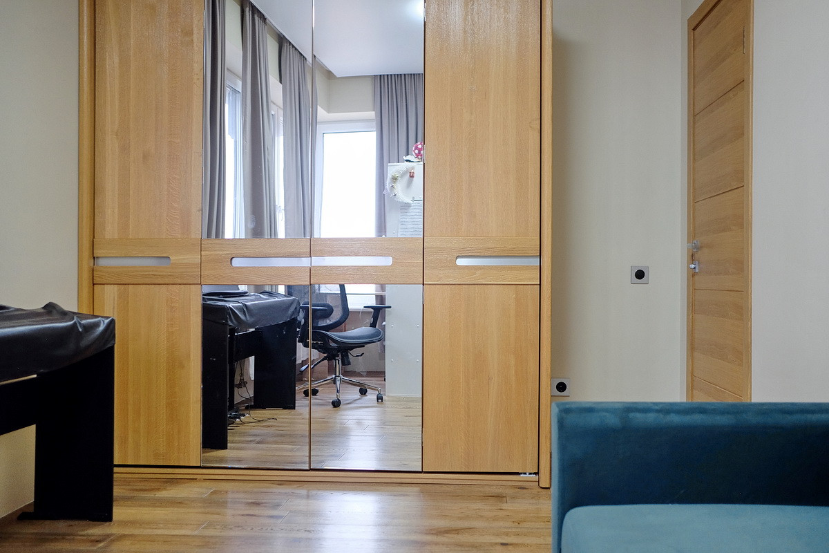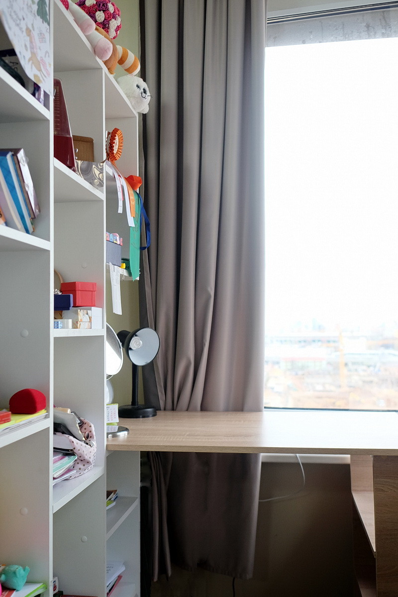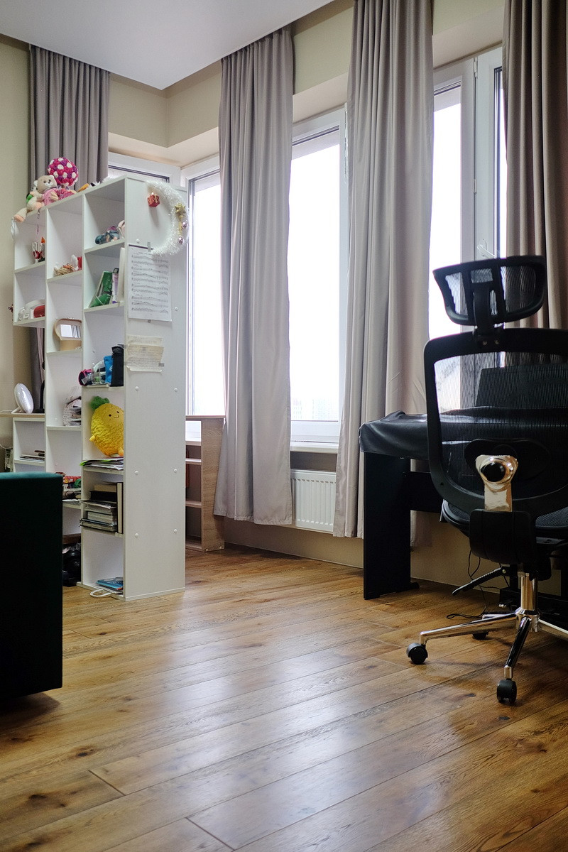 В квартире удобная для жизни планировка, подходящая для небольшой семьи: гостиная, кухня с гостиной объединены в общее жилое пространство около 35 м2, отдельные спальни 10 и 13 м2, кладовка-постирочная 2.5 м2, совмещенный санузел с душем 4.5 м2, небольшая прихожая. Высокие потолки, 11-й этаж, панорамные окна на 2 стороны - в квартире много света и простора. Из гостиной открывается вид во двор на ЖК (северо-запад), из спален - на Москву, (югозапад).