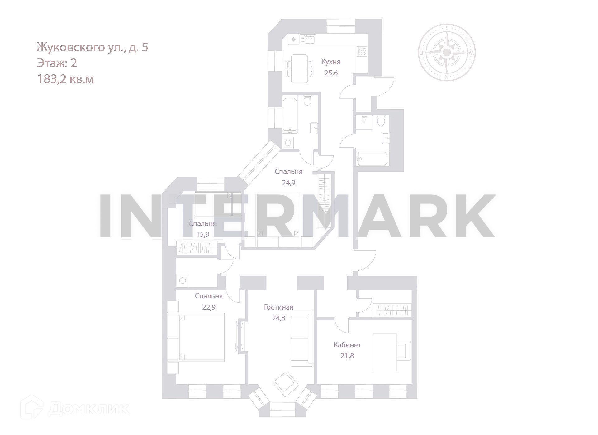 5-комнатная квартира, 183.2 м2, этаж 2 / 5, на продажу в Москве, улица Жуковского, 5