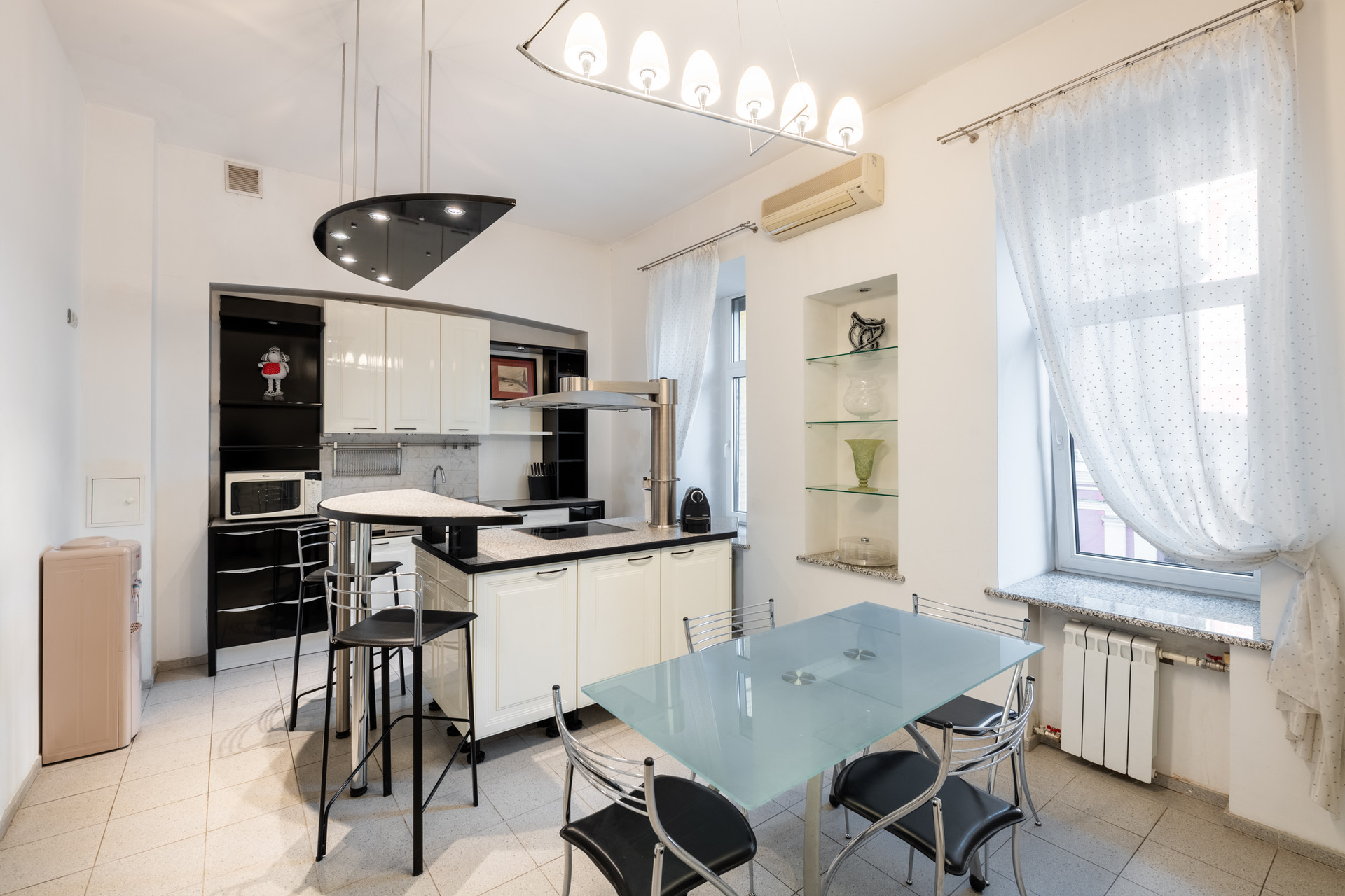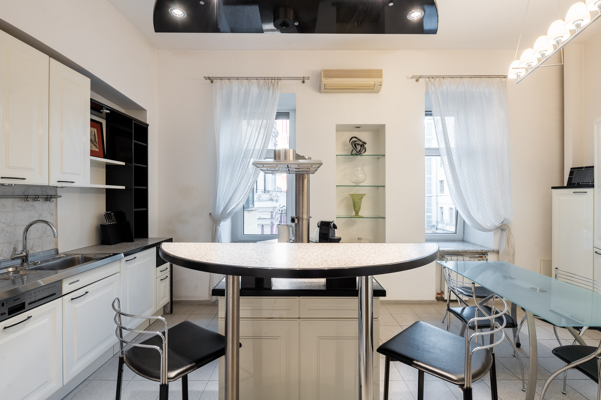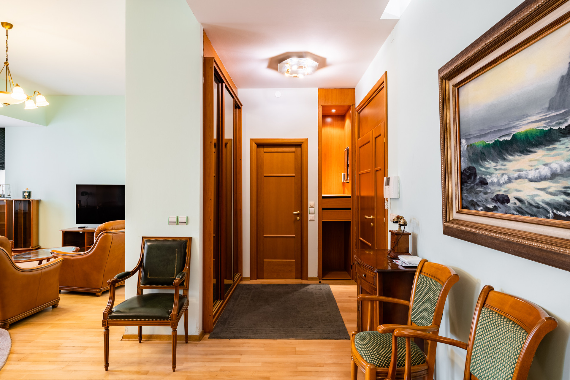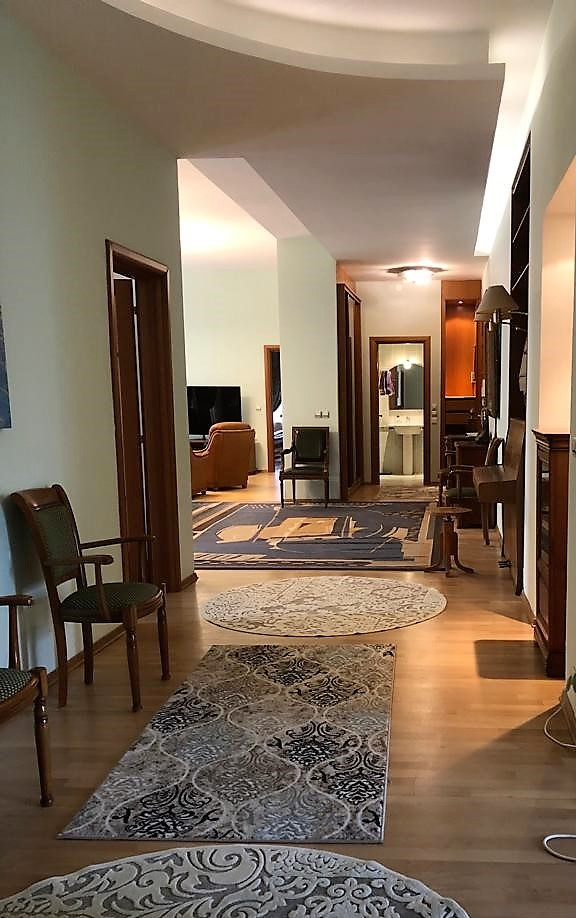 В квартире выполнен качественный ремонт с усилением перекрытий. Несущие стены только по периметру квартиры! На кухне установлен гарнитур с бытовой техникой Bosh, полы с подогревом. Из кухни есть «чёрный ход» на отдельную лестницу, ведущую в закрытый двор с приватной парковкой для автомобилей. Встроенные шкафы в прихожей. В хозяйской спальне предусмотрена отдельные гардеробная комната и с/у. Всего в квартире три санузла в том числе с гидромассажной ванной Scanpool, душевой кабиной, бойлером на случай отключения горячей воды и подогревом полов. Полы паркетные. В квартире установлены система приточно-вытяжной вентиляции, кондиционеры, автоматические рольставни, взломостойкая входная дверь – Мультилок, высокоскоростной интернет, 2 номера МГТС, трёхфазный электросчётчик на 20 кВт. Мебель в гостиной – массив дерева (Франция), мягкая мебель - натуральная кожа.