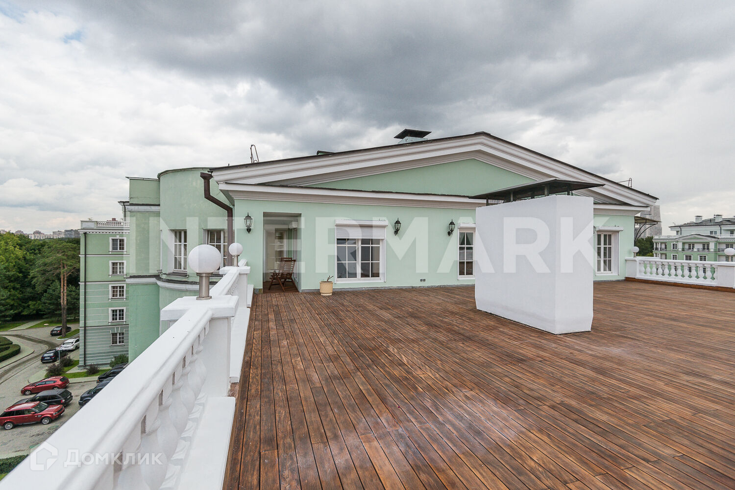Площадь квартиры 179 кв.м + терраса 165 кв.м (общая площадь посчитана с коэффициентом). Доски для террасного покрытия изготовлены из африканского дерева кусия и выглядят как палуба корабля. В доме есть подземный паркинг.