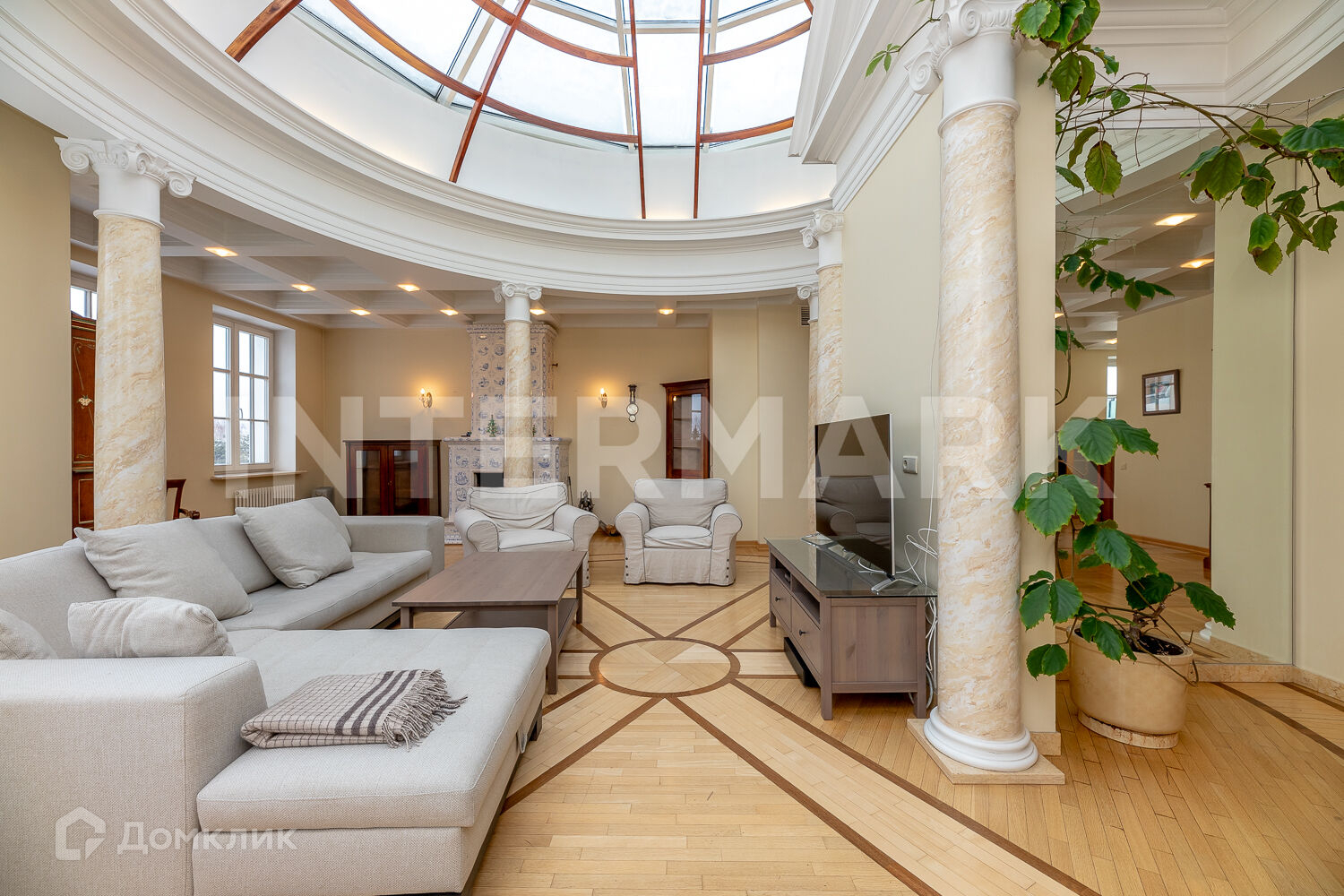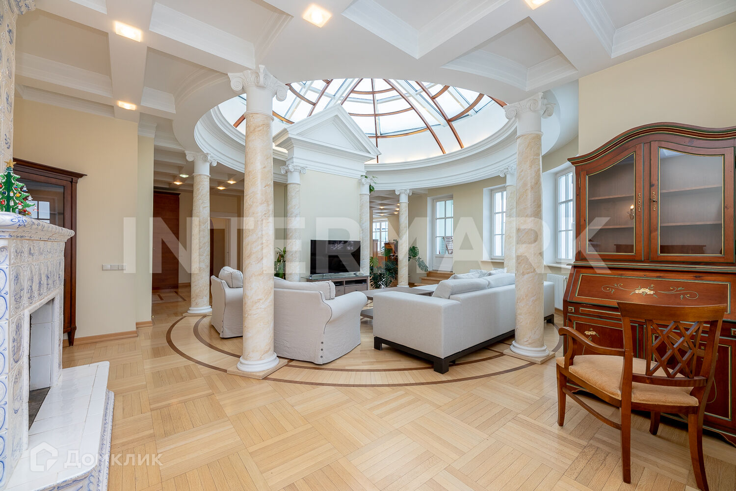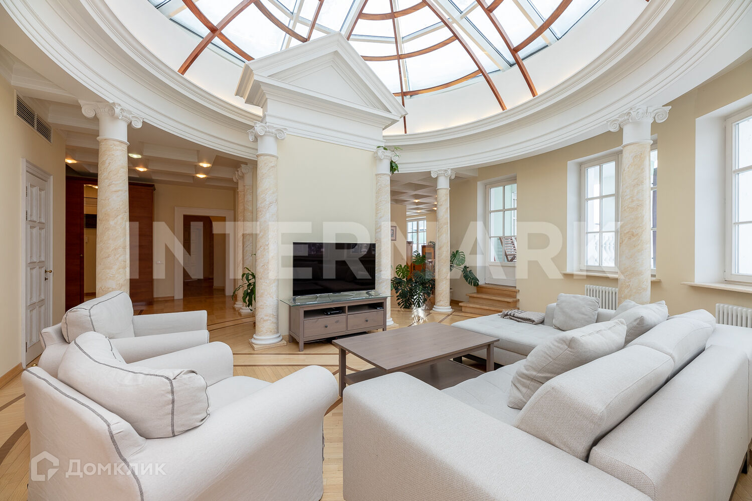 ID 62259. Роскошный четырёхкомнатный пентхаус в  жилом комплексе "Покровское-Глебово”. Авторская концепция дизайн-проекта квартиры разработана известным художником и архитектором, работающим в неоклассическом стиле в традициях итальянской архитектуры. Планировкой предусмотрены большая гостиная, над которой возвели стеклянный купол, дровяной камин, кухня с обеденной зоной, хозяйская спальня с ванной комнатой и сауной, детская с ванной комнатой и кабинет. Из окон открывается вид на водохранилище.