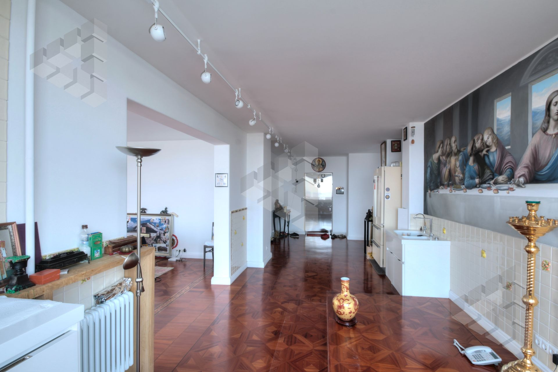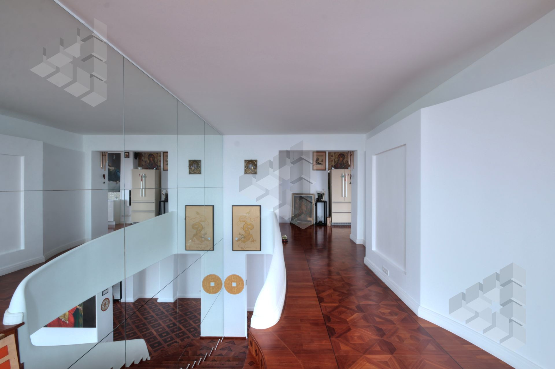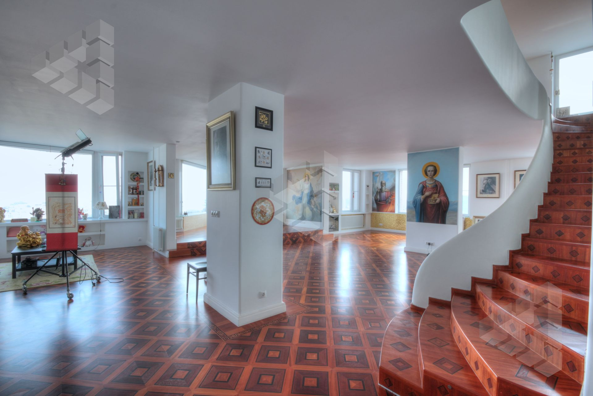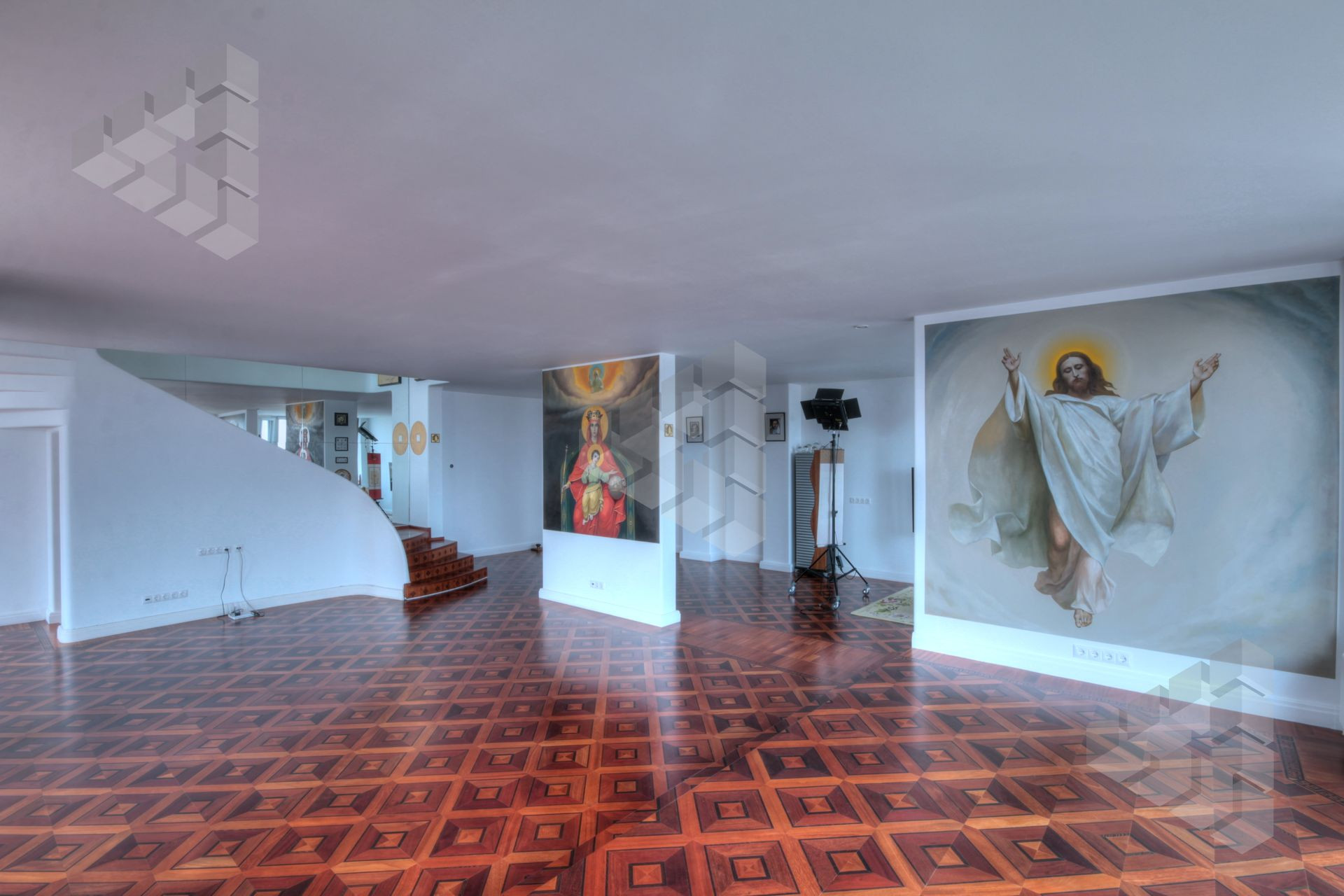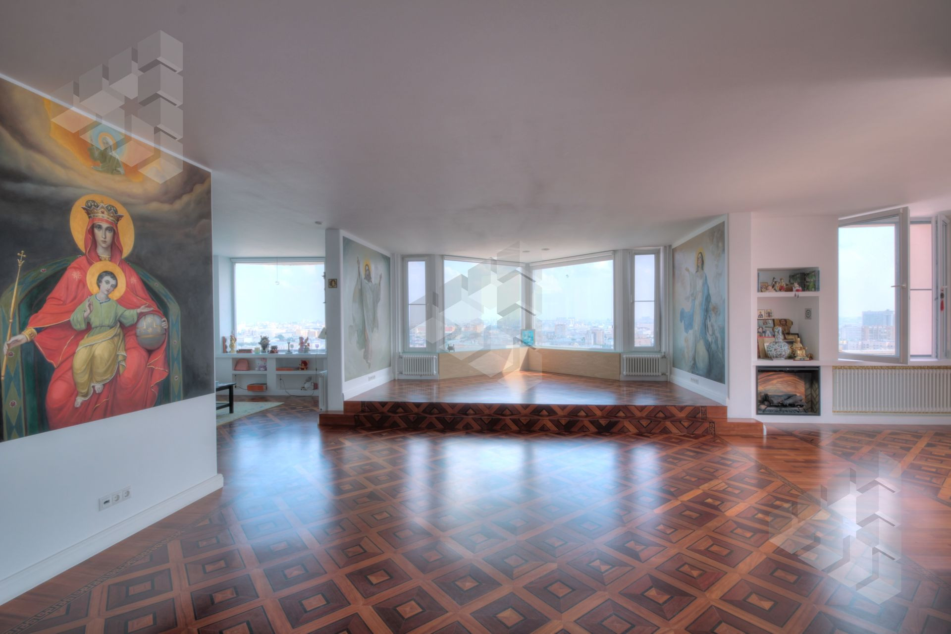 Пол выполнен из паркета уникальных сортов древесины, стены выполнены в белом цвете, под покраску, на данный момент, на многих стенах выполнена роспись ручной работы.