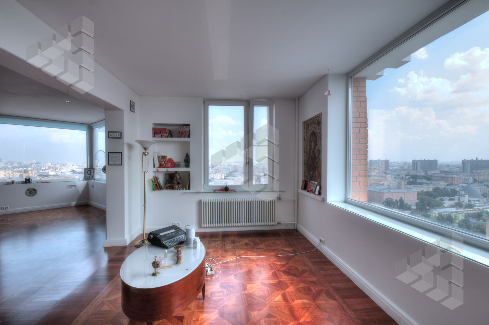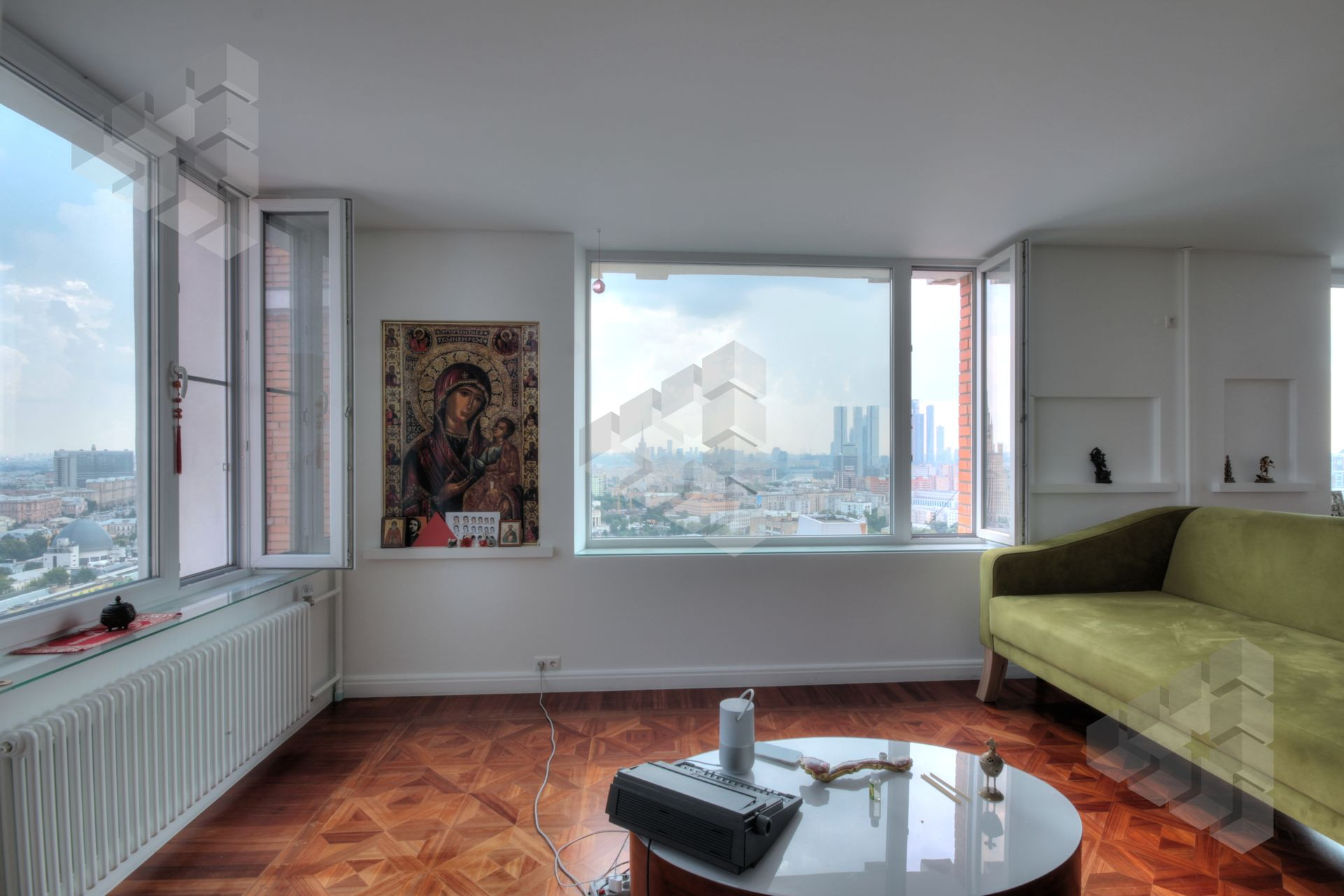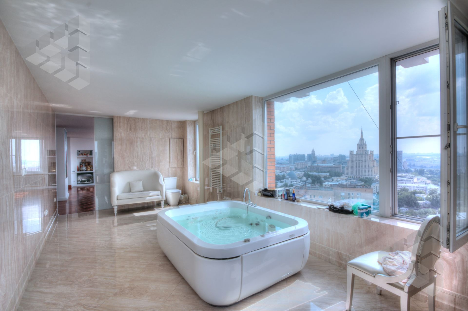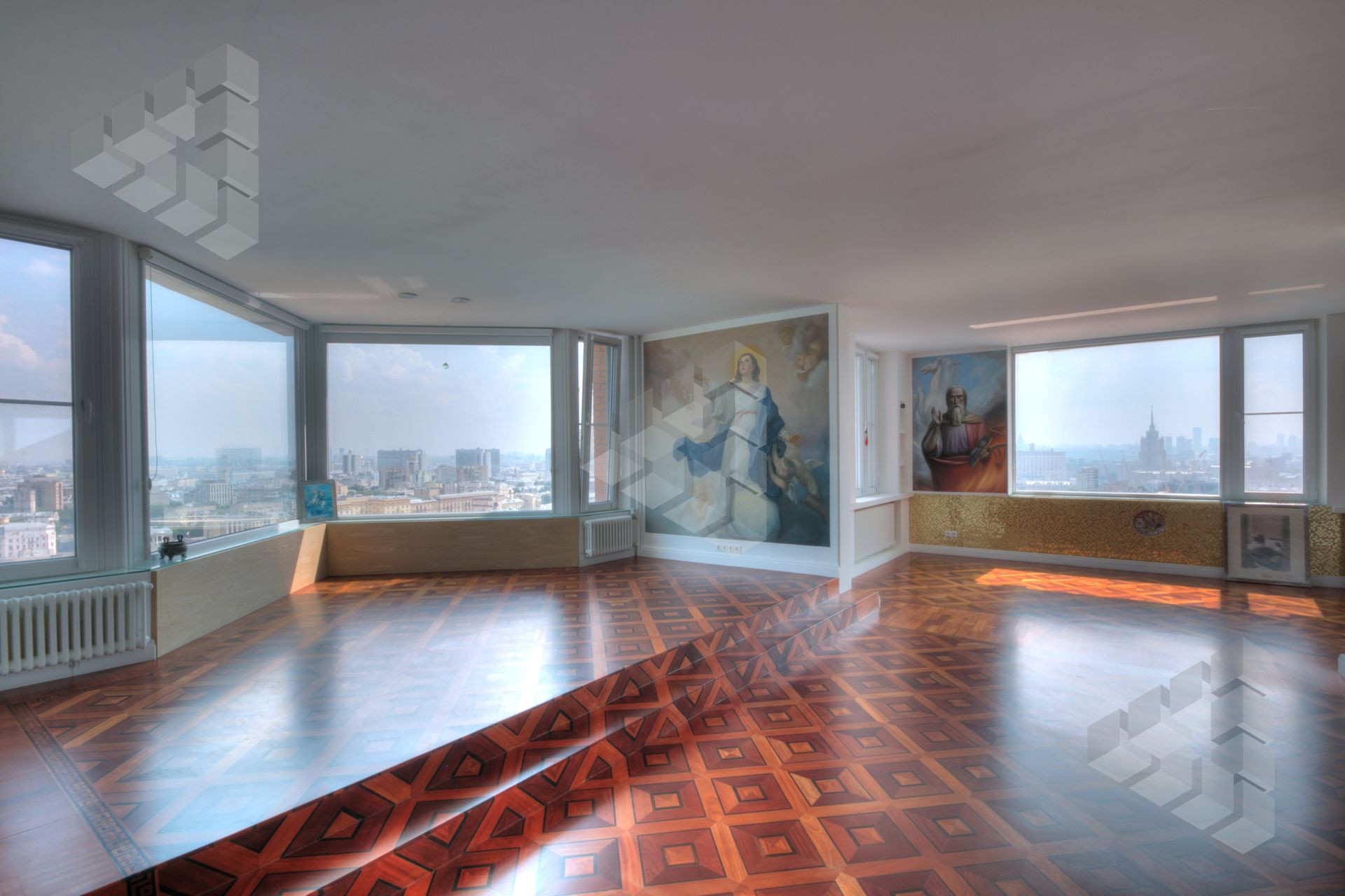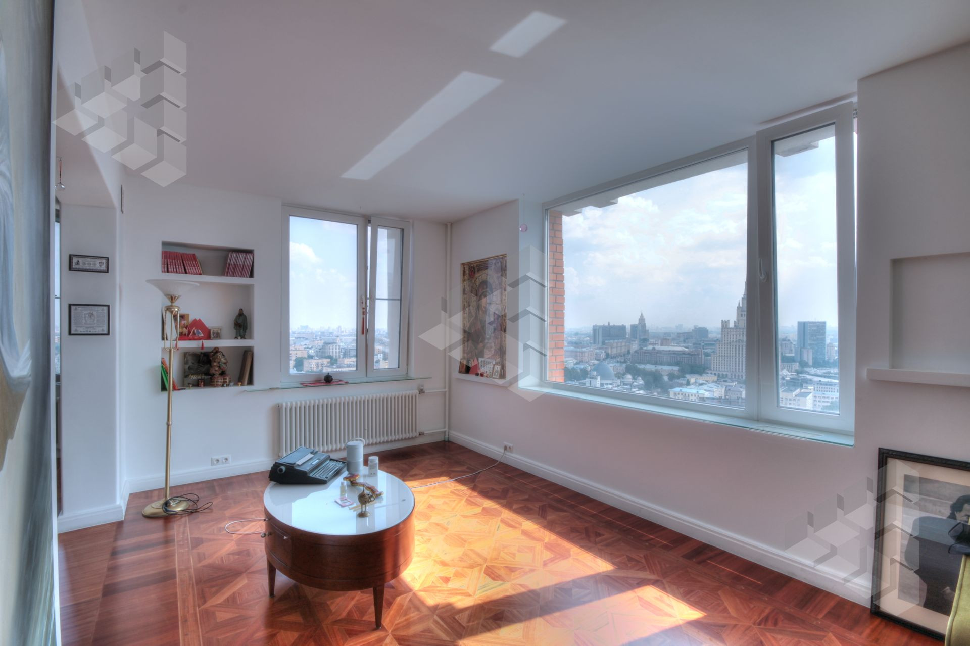 В пентхаусе были проведены уникальные работы - заменена внешняя кладка (весь фасадный кирпич) утеплены стены, добавлены оконные проемы, благодаря чему, из квартиры открывается панорамный вид на все части города: на пойму реки, Храм Христа Спасителя, Москва-Сити, все Сталинские высотки.