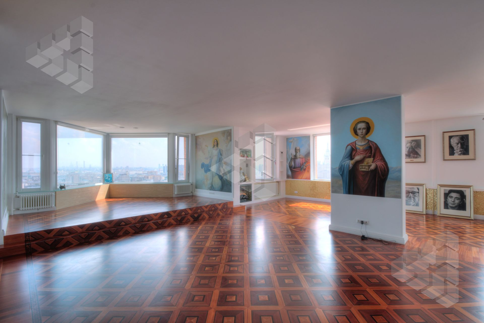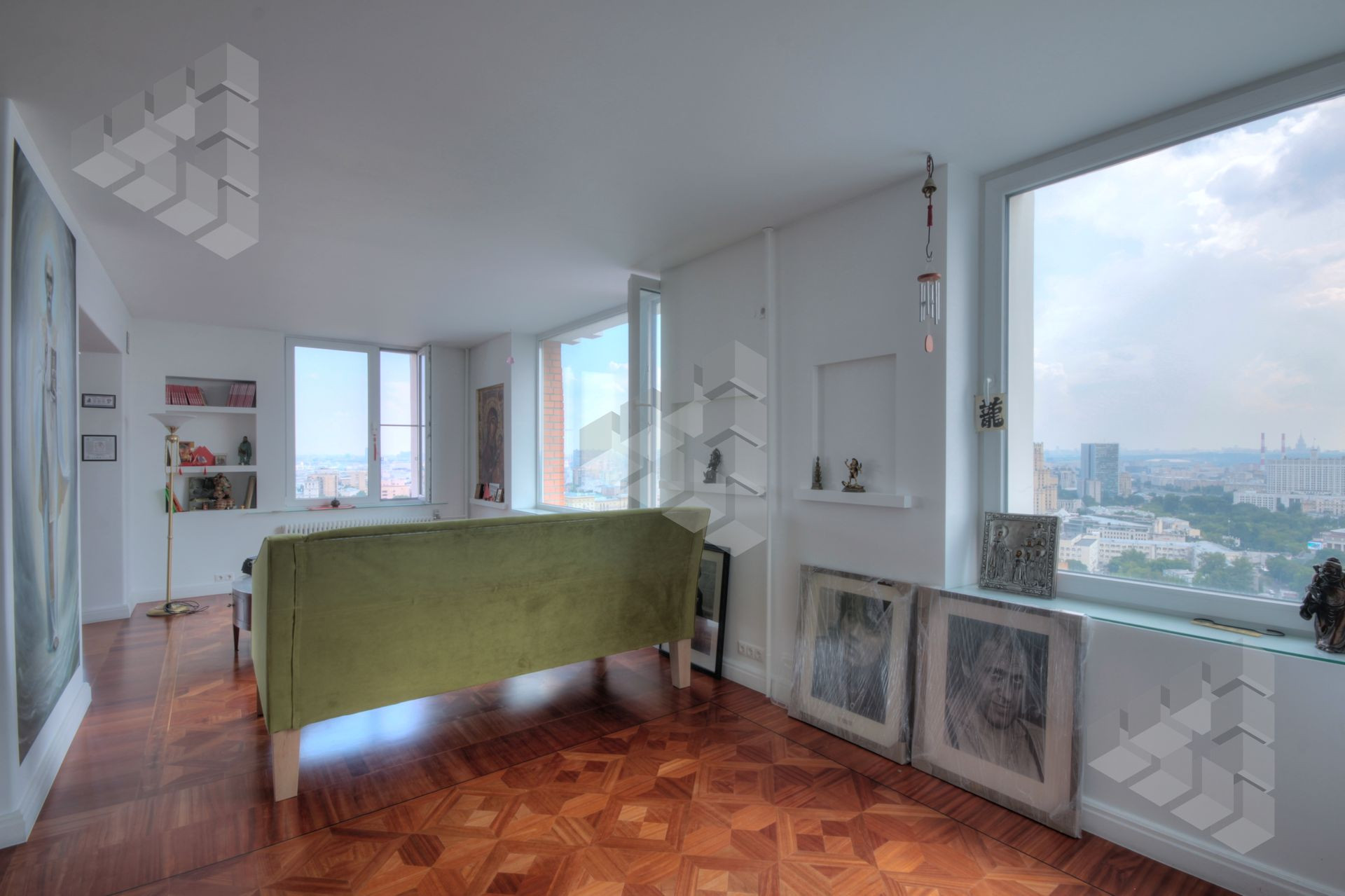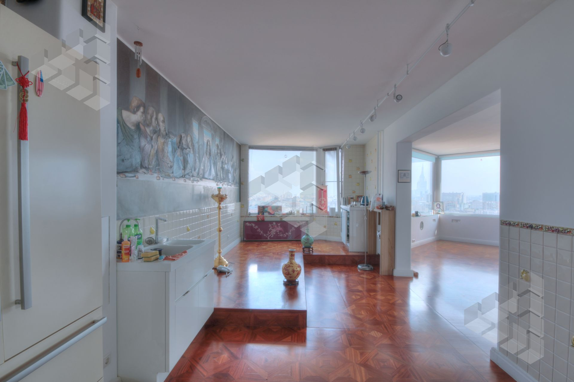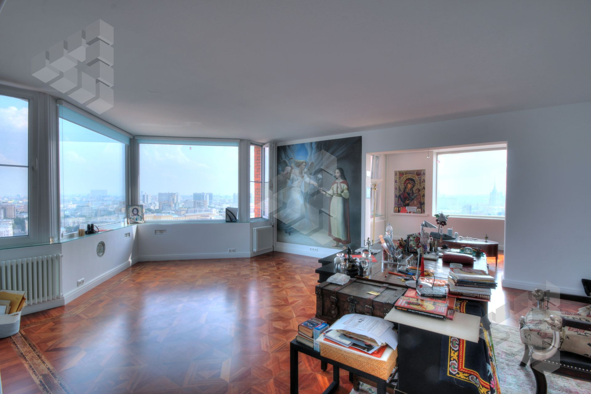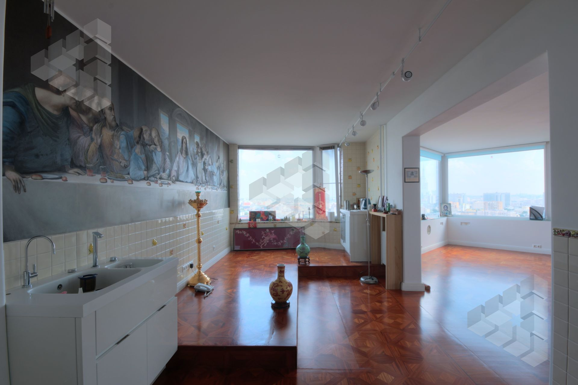 В пентхаусе были проведены уникальные работы - заменена внешняя кладка (весь фасадный кирпич) утеплены стены, добавлены оконные проемы, благодаря чему, из квартиры открывается панорамный вид на все части города: на пойму реки, Храм Христа Спасителя, Москва-Сити, все Сталинские высотки.
