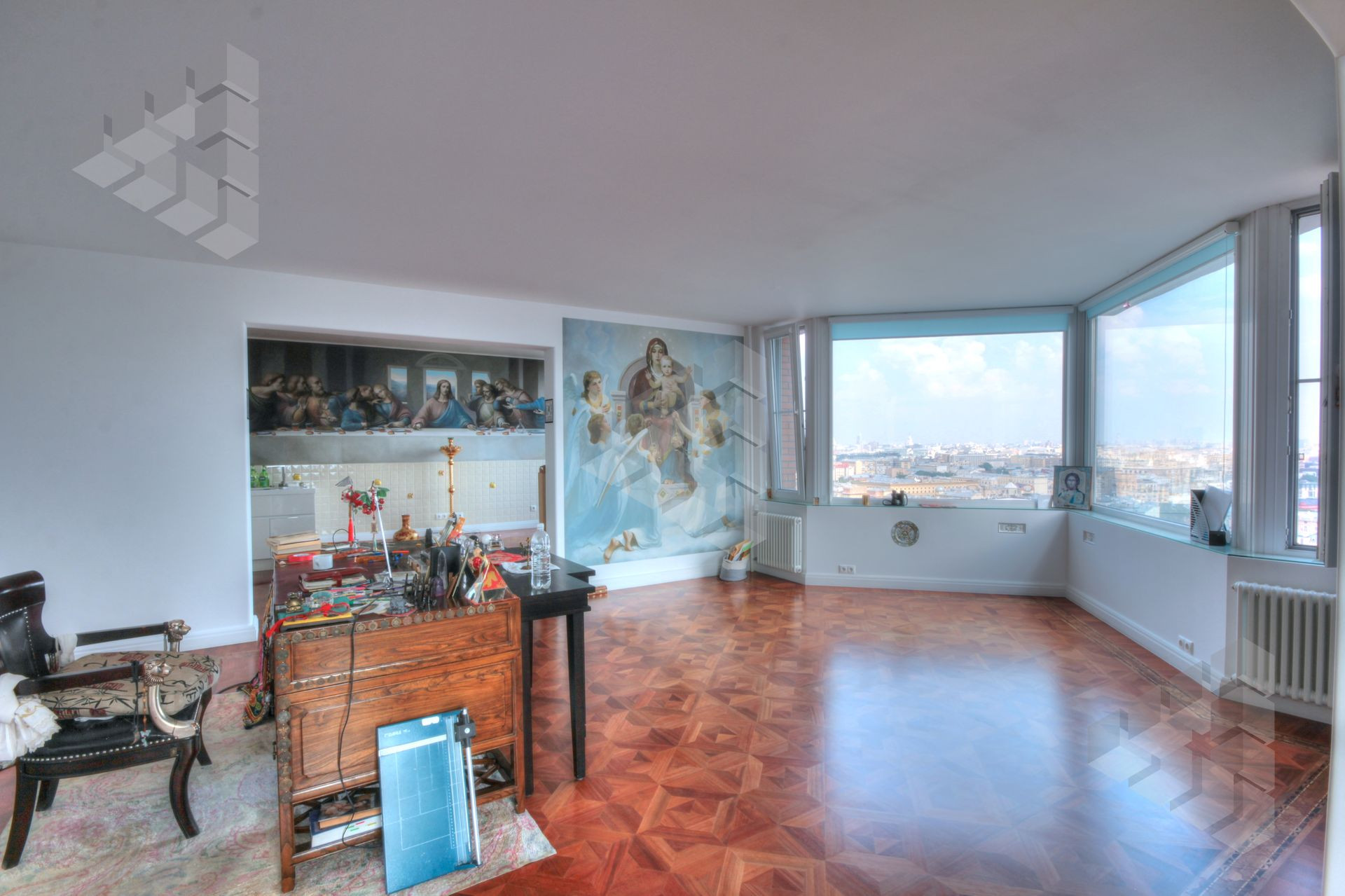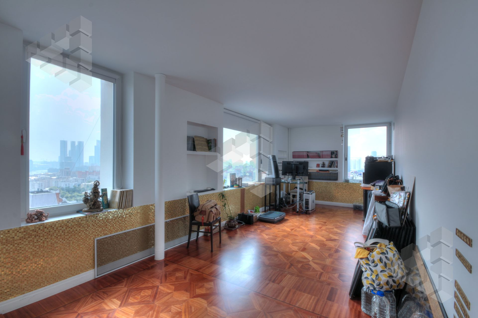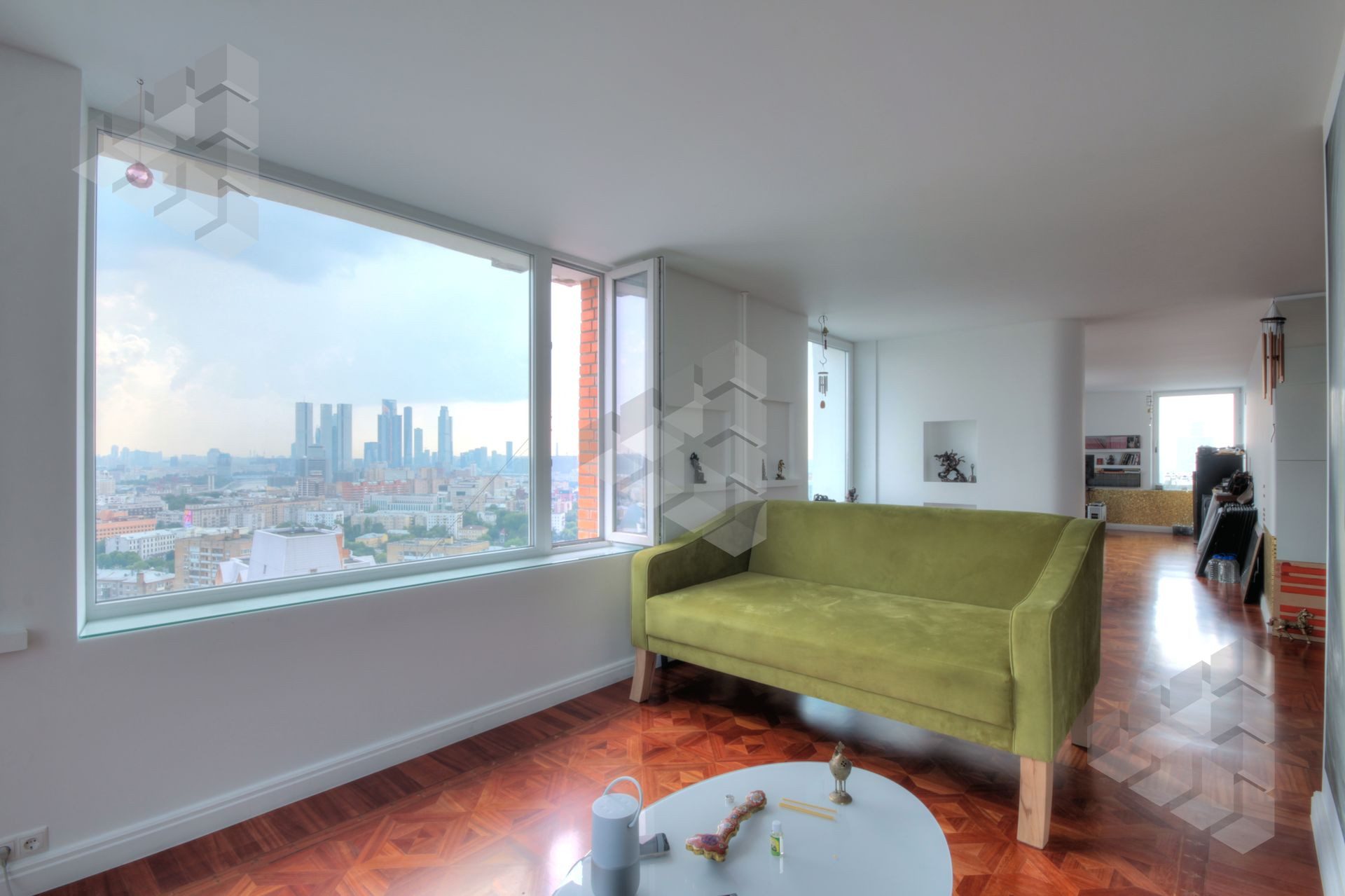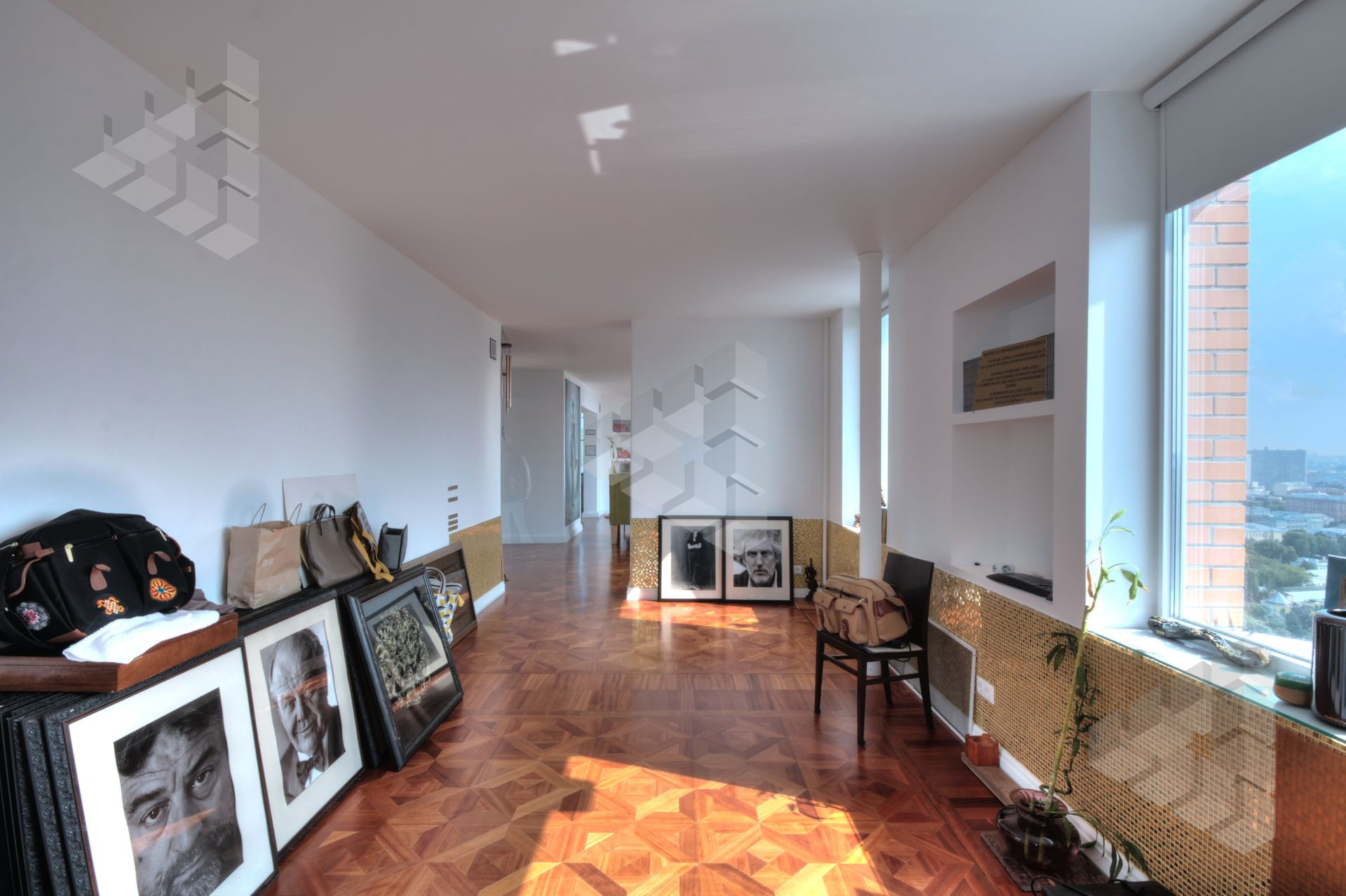В пентхаусе были проведены уникальные работы - заменена внешняя кладка (весь фасадный кирпич) утеплены стены, добавлены оконные проемы, благодаря чему, из квартиры открывается панорамный вид на все части города: на пойму реки, Храм Христа Спасителя, Москва-Сити, все Сталинские высотки.