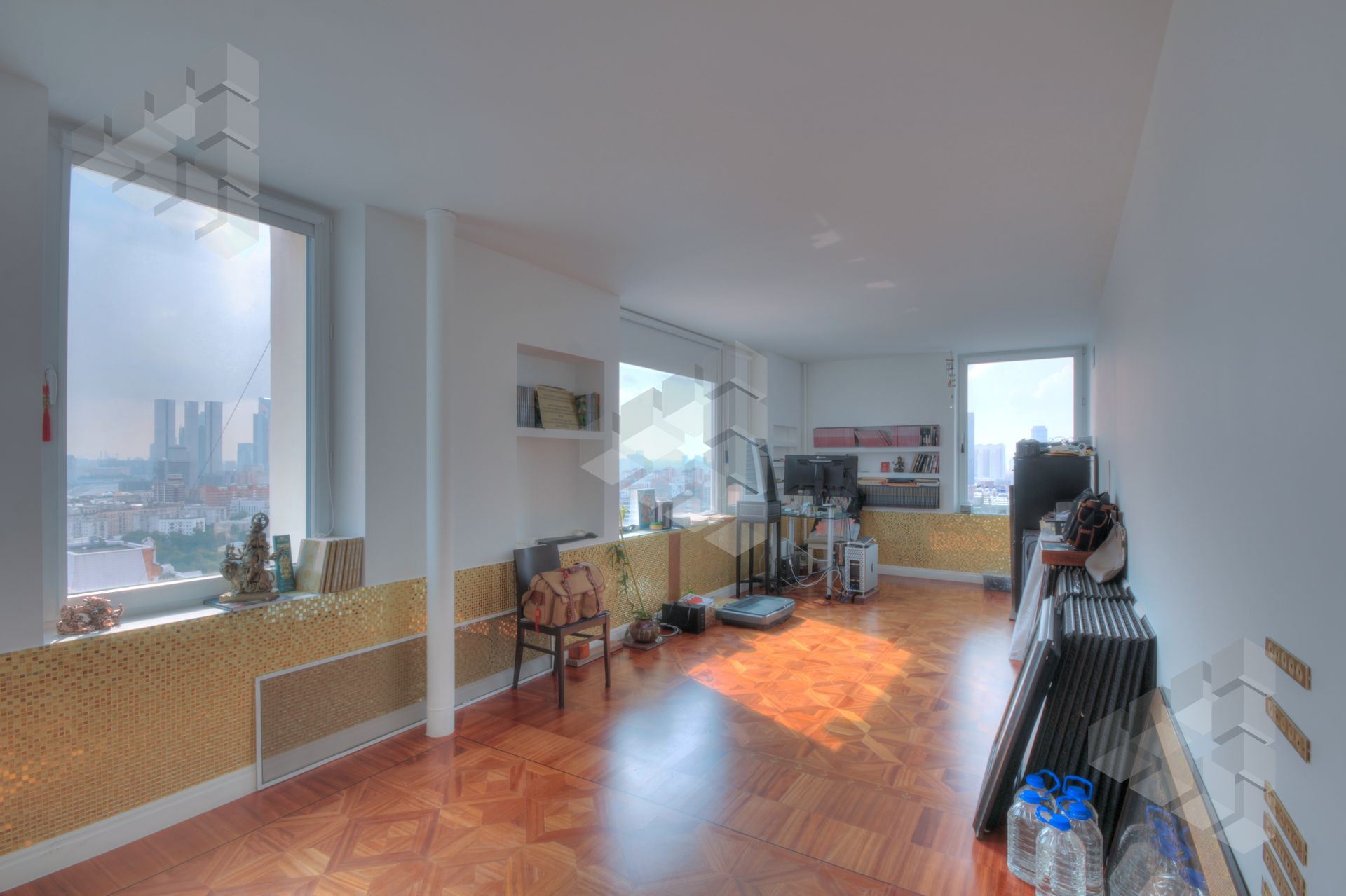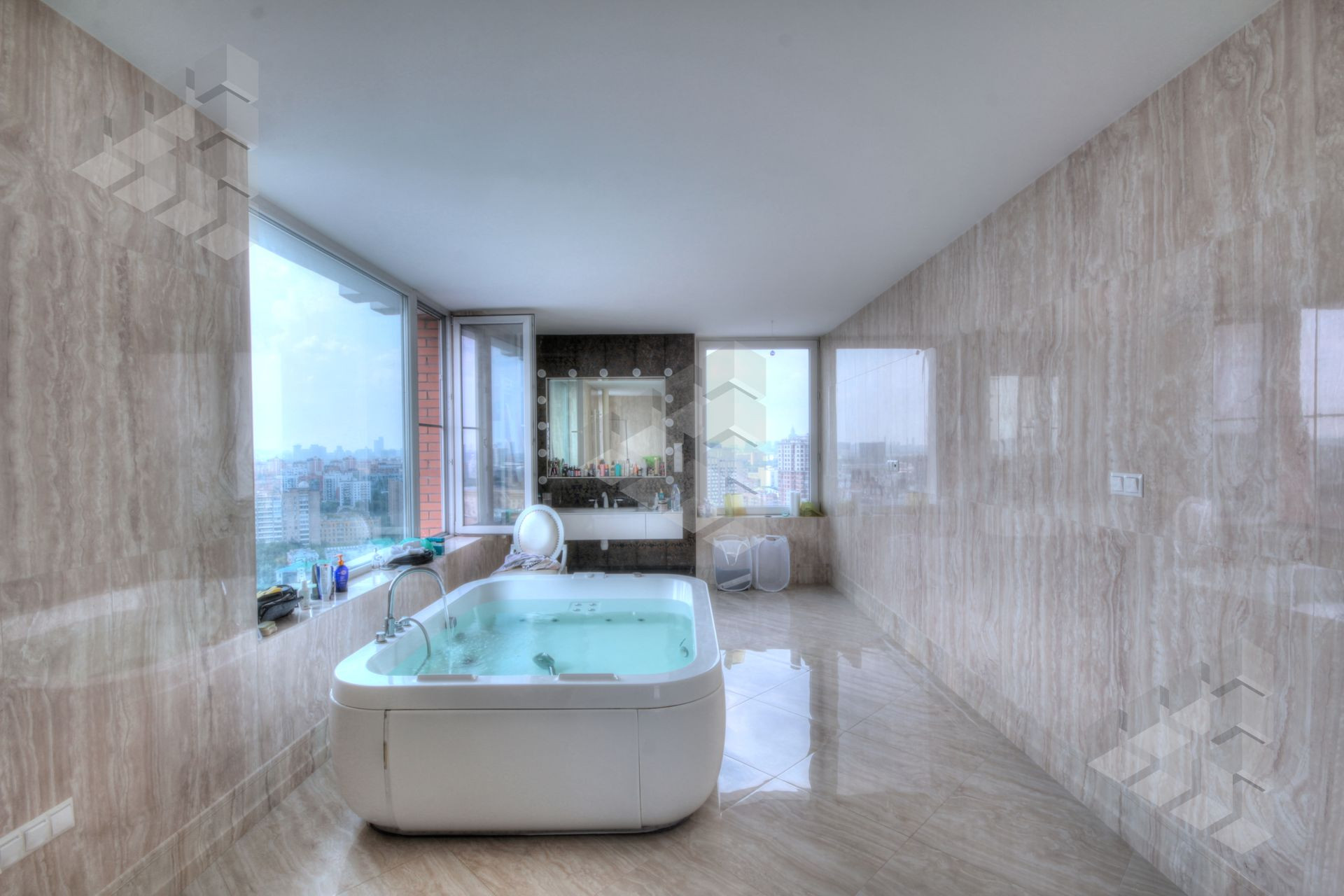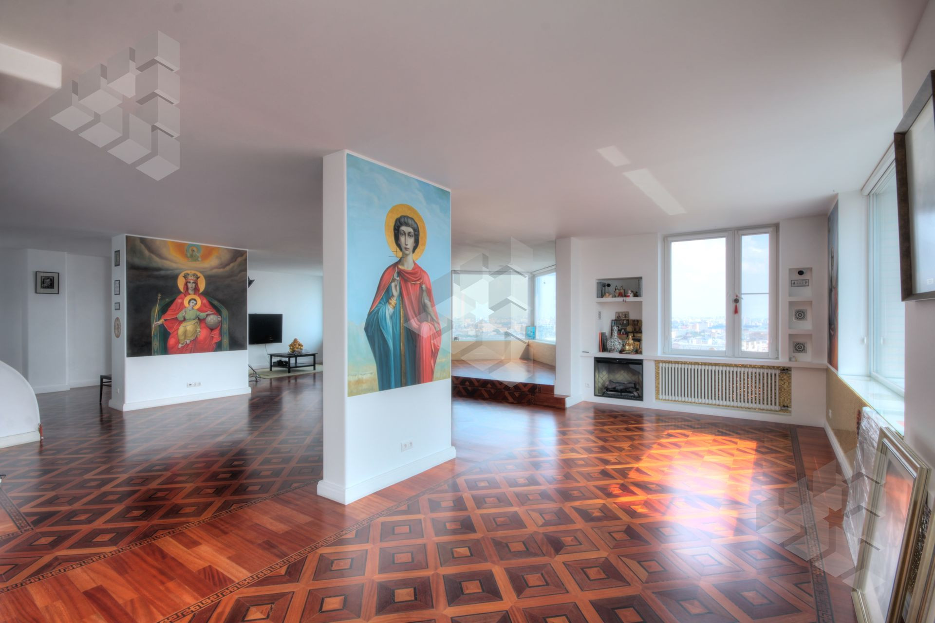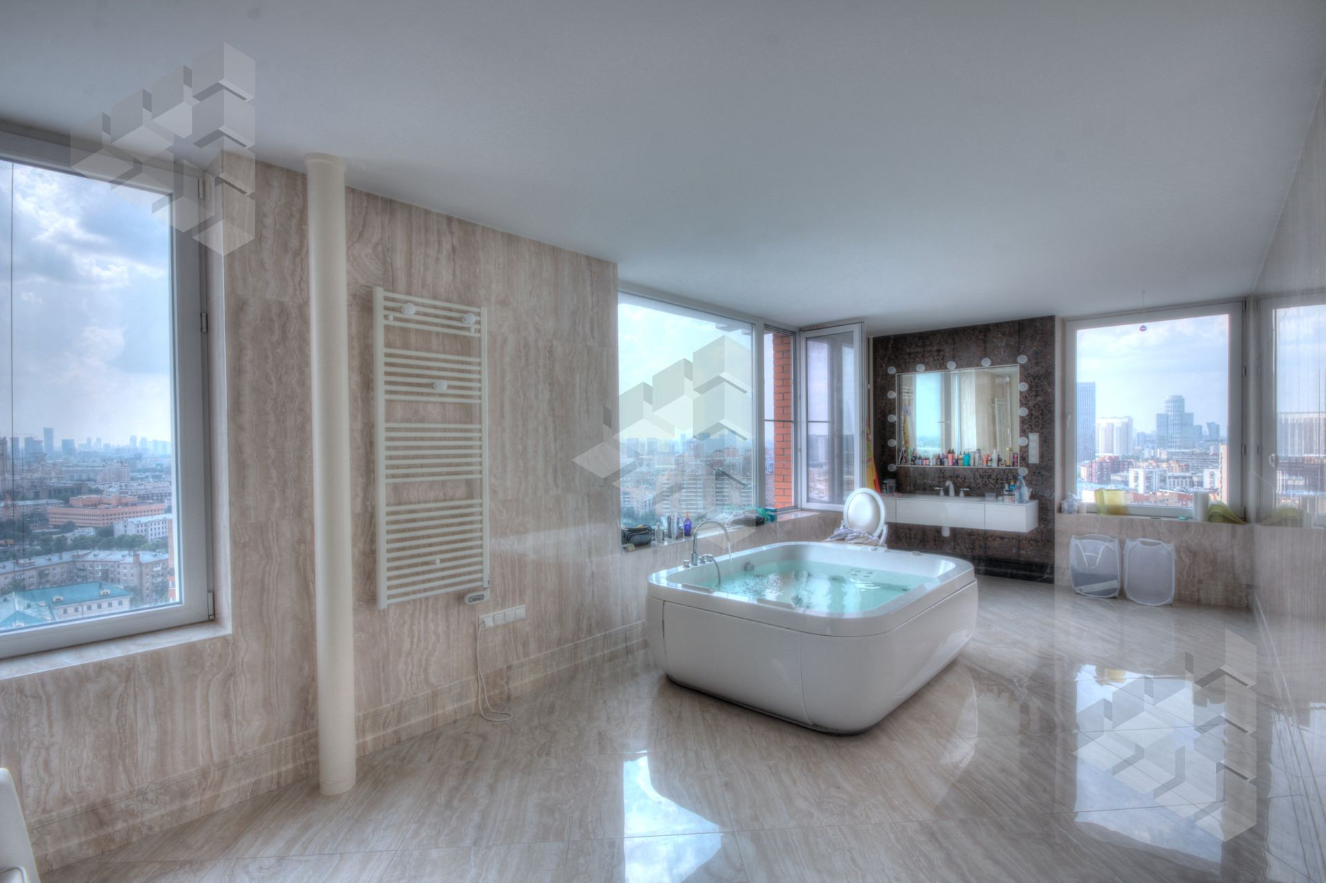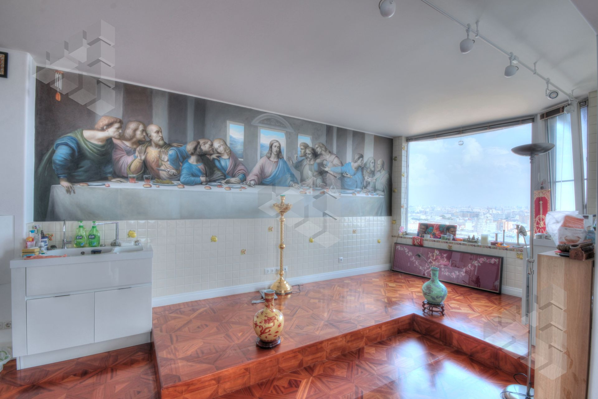 В пентхаусе были проведены уникальные работы - заменена внешняя кладка (весь фасадный кирпич) утеплены стены, добавлены оконные проемы, благодаря чему, из квартиры открывается панорамный вид на все части города: на пойму реки, Храм Христа Спасителя, Москва-Сити, все Сталинские высотки.