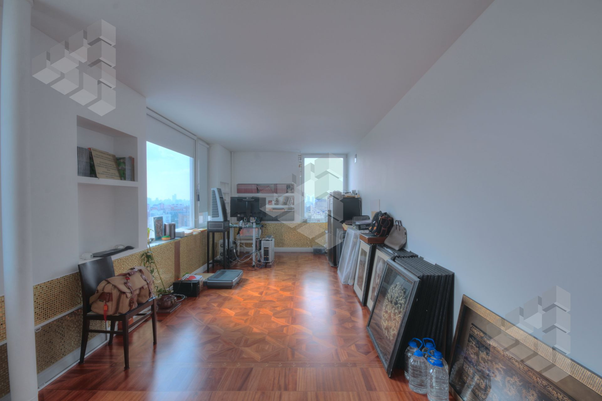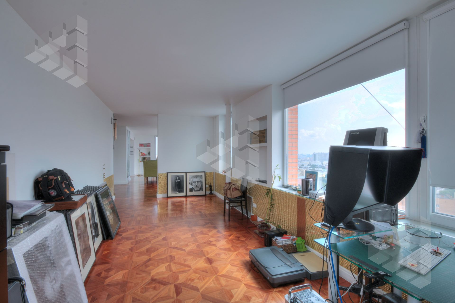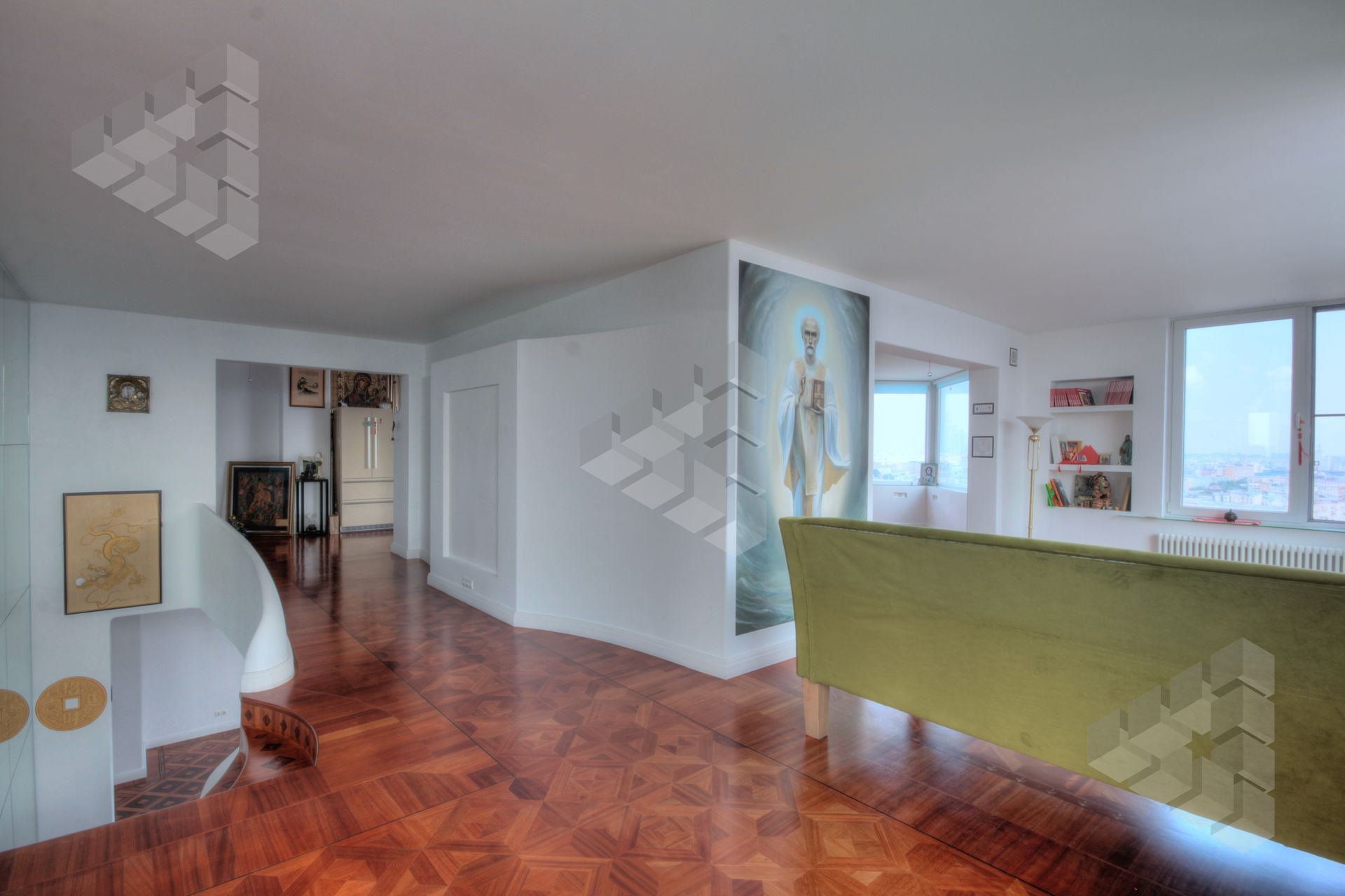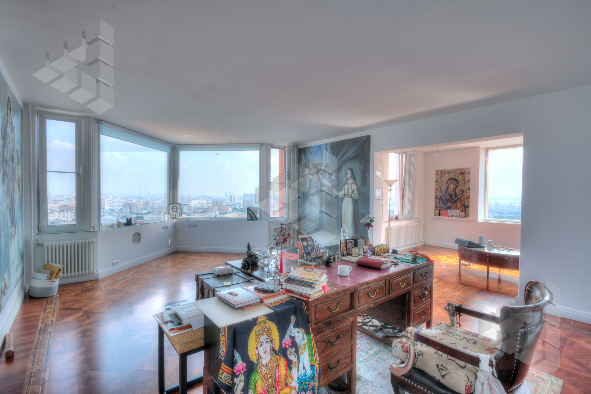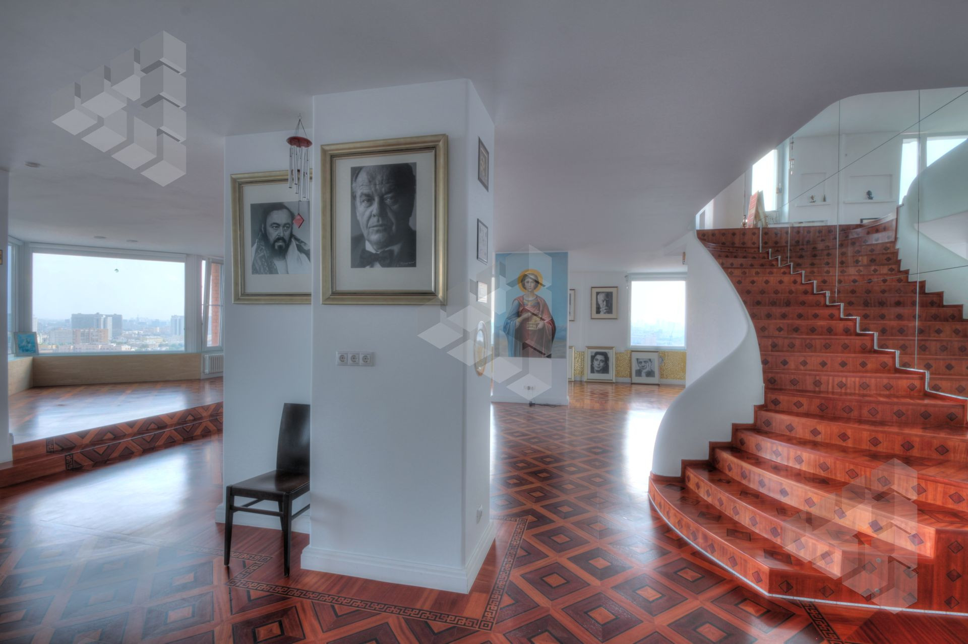 В пентхаусе были проведены уникальные работы - заменена внешняя кладка (весь фасадный кирпич) утеплены стены, добавлены оконные проемы, благодаря чему, из квартиры открывается панорамный вид на все части города: на пойму реки, Храм Христа Спасителя, Москва-Сити, все Сталинские высотки.